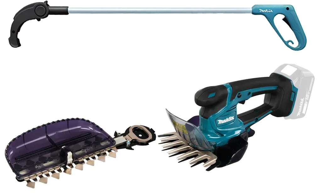 Garten- und Grünflächenpflege Elektrogartenwerkzeug - Schneidet Gras und Sträucher: die makita Akku-Strauch- und Grasschere DUM604RFXOb Sie nun Ihren Rasen trimmen oder Ihre Sträucher stutzen wollen: Mit der makita Akku-Strauch- und Grasschere DUM604RFX können Sie beides mit einem Gerät! An der Akku-Strauch- und Grasschere lässt sich sowohl das im Lieferumfang enthaltene 16,0 cm-Grasscherblatt als auch das ebenfalls beiliegende 20,0 cm-Strauchscherenmesser montieren. Die Aufsätze können Sie einfach und schnell per Knopfdruck austauschen. Die Anschaffung eines Zweitgeräts ist somit überflüssig.Super Verarbeitung, sauberer SchnittEin gutes Messer erleichtert Ihnen die Gartenarbeit. Bei diesem Modell sind die Scherblätter mit beidseitig geschliffenen, rostfreien Messern bestückt. Dank der bewährten makita-Qualität werden Sie lange Freude an der Akku-Strauch- und Grasschere DUM604RFX haben und sich an Ihrem gut gepflegten Garten erfreuen.Komfortable Bedienung und lange AkkulaufzeitDurch das geringe Gewicht und die kompakten Maße ist die Grasschere besonders einfach in der Handhabung. Der leistungsstarke 18,0 V Lithium-Ionen-Akku rt Ihnen eine lange Laufzeit. Falls der Akku leer ist, können Sie ihn schnell wieder mit dem mitgelieferten Ladegerät aufladen. Das Schnellladegerät verfügt über eine 3-stufige Status-Anzeige, sodass Sie über den Stand des Ladevorgangs stets informiert sind. Ihre makita Akku-Strauch- und Grasschere kommt mit folgendem Lieferumfang zu Ihnen: 1x ... Dieses Set kombiniert die DUM604Z Grasschere mit einer praktischen Griffverlängerung für komfortableres Arbeiten. ![]() ![]() Makita Grasschere DUM604Z + Griffverlängerung 198516-8