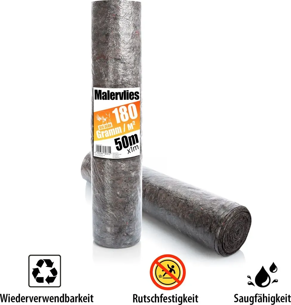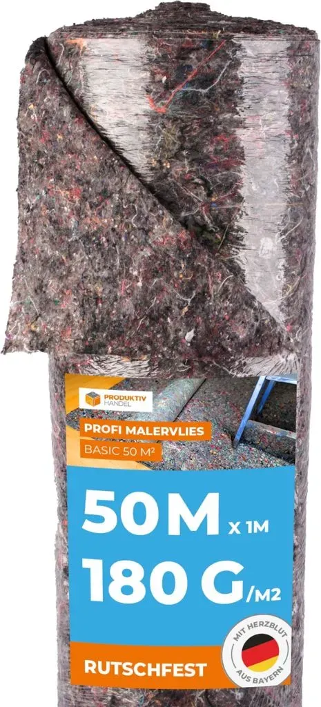 0,65 /m - Kategorie: Baumaterial - Helo - GTIN:4250492196439 - Eine Rolle HELO Antirutsch Profi Malervlies mit 50 m Länge und 1 m Breite aus Baumwollfasern mit Farb- und Wasser undurchlässiger Antirutsch Unterseite, 220 g/m2 FlächengewichtDieser wiederverwendbare Abdeckschutz darf bei versierten Heimwerkern oder Profis am Bau nicht in der Grundausstattung fehlen. Das 1 m breite Maler- und Renovierungsvlies bietet Schutz bei Maler- und Renovierungsarbeiten. Mit seinen 50 Metern Länge eignet sich wunderbar für das großflächige Abdecken von Fliesen, Teppichen, Parkettböden oder anderen Bodenbelägen zum Schutz vor Staub, Farbklecksen oder als Schutz vor Kratzern auf Parkett und anderen empfindlichen Böden. Die Antirutsch Unterseite haftet gut auf allen Böden und verhindert durch seine speziell beschichtet Unterseite das Durchdringen der Flüssigkeiten.Eigenschaften:Anti-Rutsch Unterseite bietet festen Halt auf allen BödenVlies lässt sich leicht auslegen und ist mehrfach verwendbarSchmutz an Kleidung und Schuhe wird nicht weitergetragenOberseite: Aus Baumwollfasern (220g/m2 Flächengewicht)Unterseite: Anti-Rutsch PE-Folie verhindert Durchdringen von Farbe und FlüssigkeitZum großflächige Abdecken von Fliesen, Teppichen, Parkettböden etc.Flächengewicht: 220 g/m2Oberseite: BaumwollfasernBeschichtung Unterseite: PE FolieLänge: 50 mBreite: 1m - 32,51 Euro bei Kaufland.de - gefunden von billiger.de STIER bietet ein 180g/m² Malervlies für 33.99 Euro, das als Premium Oberflächenschutz für Handwerker beworben wird. ![]() ![]() STIER Malervlies, Gewicht 180 g/m2, Länge 50 m, Abdeckvlies, Schutzvlies, Premium Oberflächenschutz für Handwerker Vlies grau, PE Anti Rutsch Beschichtung