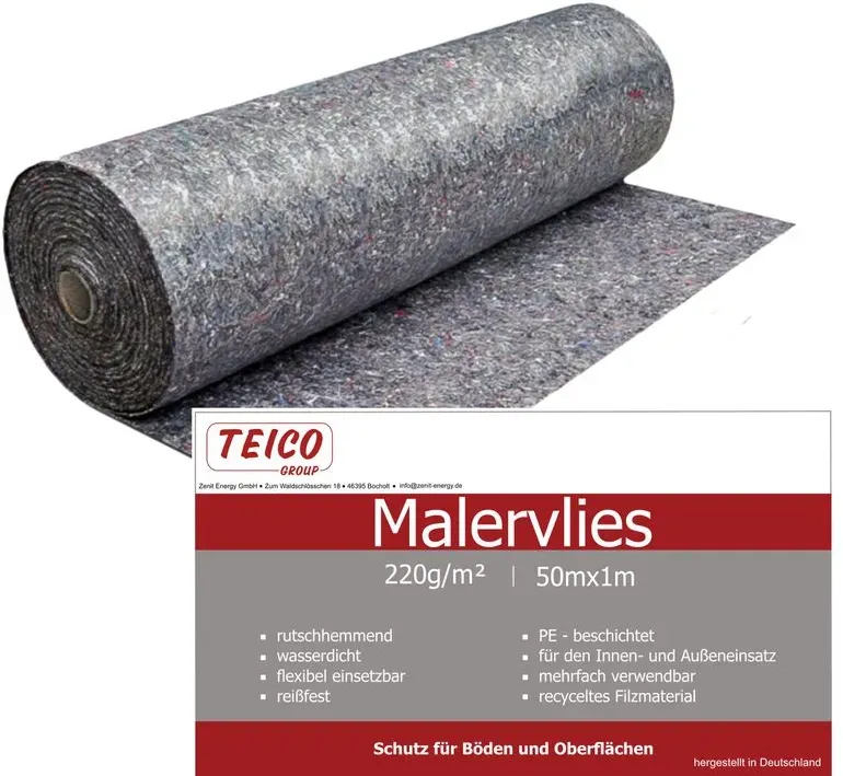Kategorie: Sonstige Artikel in Bauen & Renovieren - STROXX - GTIN:5707436128128 - FüR GRO E FLäCHEN: Das STROXX Maler- und Abdeckvlies schützt auch große Flächen vor Verschmutzung, um eine professionelle Renovierung zu ermöglichen SAUGSTARK & ROBUST: Das Schutzvlies ist durch sein Materialgewicht von 180 Gramm Baumwolle pro Quadratmeter extra dick und nimmt so noch mehr Flüssigkeit auf. Dadurch kann es sogar mehrfach verwendet werden RUTSCHFESTE UNTERLAGE: Unser Baumwollvlies besteht aus natürlichen Rohstoffen mit einer Anti-Slip PE-Folie an der Unterseite, welche festen Halt auf unterschiedlichsten Untergründen bietet VIELSEITIG EINSETZBAR: Der Oberflächenschutz ist unverzichtbar bei allen Maler-, Abdeck-, Renovier- und Bauarbeiten. Auch bei Umzügen ist er zum Schützen von Böden und Treppen bestens geeignet LEICHT ZUSCHNEIDBAR: Schütze deine Bodenbeläge in der Bauphase oder bei Malerarbeiten mit dem super beständigen Malervlies. Du kannst es mühelos für ausgefallene Ecken und Winkel des Hauses zuschneiden - 22,90 Euro bei Amazon Marketplace Home Improvement - gefunden von billiger.de Für 24.95 Euro erhalten Sie hier ein 220g/m² Malervlies, das eine höhere Strapazierfähigkeit verspricht. ![]() ![]() TEICO Malervlies, Malerabdeckvlies, 50m Rolle, 100cm x 50 m, 220g/m2