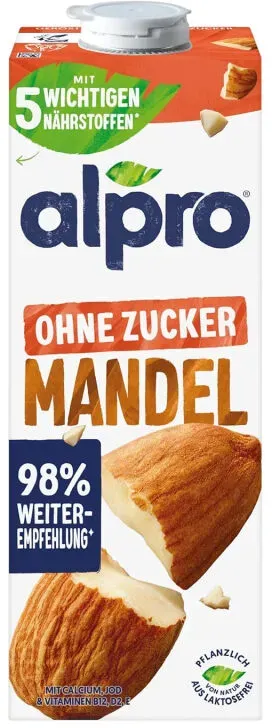 Kategorie: Käse & Milchprodukte - ALPRO - GTIN:5411188112709 - Alpro Mandelmilch ungesüßt UHT 1L ist eine milchfreie, laktosefreie Pflanzenmilch aus Mandeln, angereichert mit den Vitaminen B2, B12, D2 und E, und ohne zugesetzten Zucker. Sie ist kalorienarm und geeignet für Personen, die auf Milchprodukte oder Gluten verzichten. - 2,99 Euro bei Joybuy - gefunden von billiger.de Dieser Alpro Mandeldrink geröstet ist eine beliebte und vielseitige Option, die vegan, laktosefrei und mit Calcium angereichert ist. ![]() ![]() Alpro 1L Mandeldrink geröstet, vegan & laktosefrei, fett- und zuckerarm, mit Calcium und Vitaminen