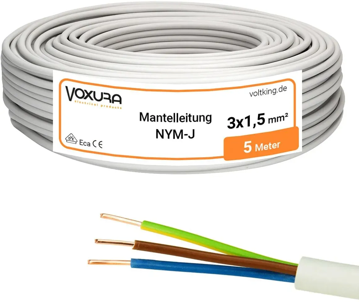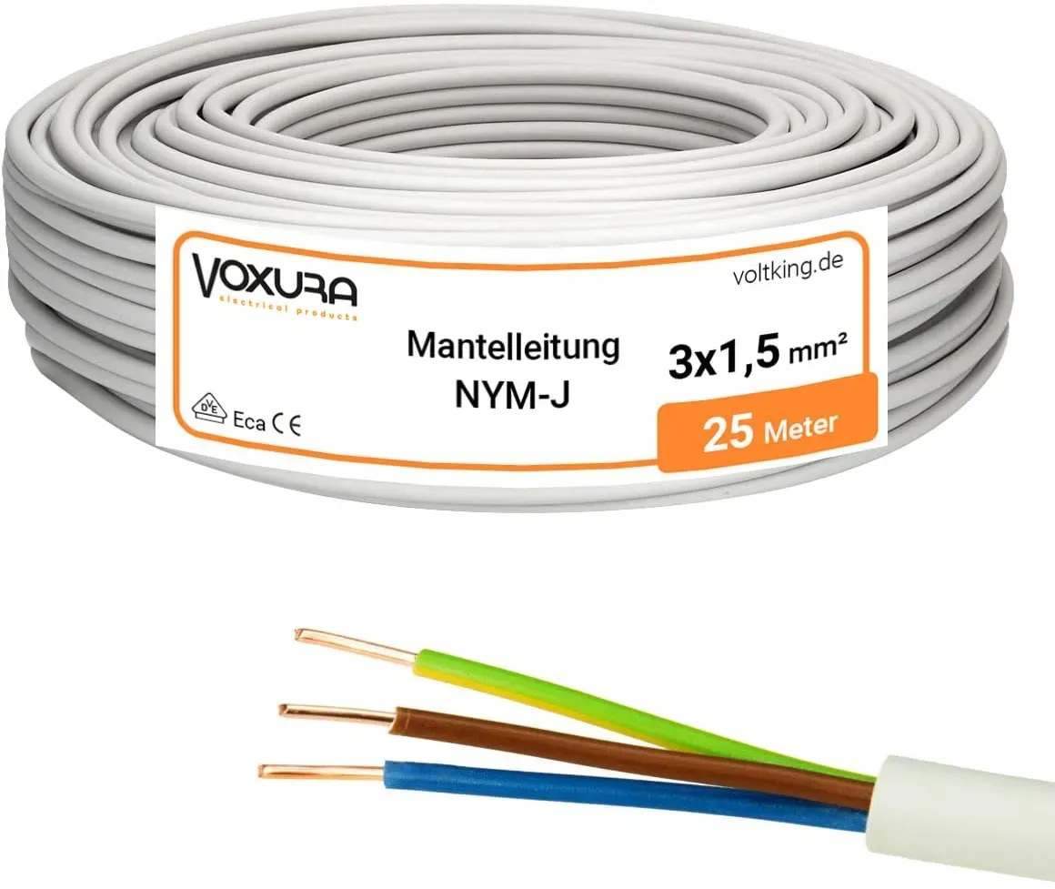 Elektroinstallation Elektrische Leitungen & Gehäuse Messtechnik und Werkstattbedarf Elektromaterial und Elektroinstallation Kabel, Leitungen und Drähte Energiekabel 1kV, für feste Verlegung Elektronik und elektronische Komponenten - EAN:4044774725291 - Die NYM-J ist die Standardleitung in der Elektroinstallation. Sie ist geeignet für die Verlegung in Putz, Mauerwerk und Beton.Standardleitung für Putz und MauerwerkAderisolation auf PVC-BasisFlammwidrig nach IEC 60332-1-2Außenmantel auf PVC-BasisAnwendungsgebieteZur Verlegung über, auf, im und unter PutzIm Mauerwerk und im Beton, ausgenommen die direkte Einbettung in Schüttel-, Rüttel- oder StampfbetonFür die Verwendung im Freien geeignet, sofern sie vor direkter Sonneneinstrahlung geschützt sind - gefunden von Kelkoo Ein 50m Ring von Voxura, der ein gutes Preis-Leistungs-Verhältnis für größere Installationsvorhaben bietet. ![]() ![]() Voxura NYM-J 3x1,5 mm2 50m Ring Mantelleitung Installationskabel Stromkabel Feuchtraumkabel Kupfer