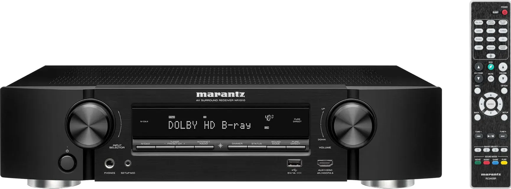 Auf Lager Versand durch AmazonMarantz NR1510 5.2-Kanal AV-Receiver, HiFi Verstärker, 50W, 4K, Dolby Audio, HEOS Built-in, 6 HDMI Eingänge, Bluetooth, WLAN - Schwarz