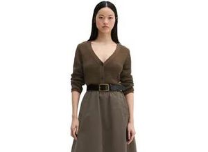 Cardigans Pullover und Strickjacken Damenmode Bekleidung Strickjacken Cardigans Damenbekleidung - EAN:7333544039551 - Moderner Klassiker aus exklusivem Bändchengarn aus hochwertigem Bio-Baumwolle-Polyester-Mix: Cardigan in zeitlosem, femininen Slim Fit. Zu den Features gehören ein tiefer V-Ausschnitt, ein Armausschnitt mit Fully-Fashioned-Details und eine gerade, lässig gerollte Saumlinie. Er wird mit farblich kontrastierenden Knöpfen in Hornoptik geliefert. Unser Styling-Tipp: Entweder im Layering über Kleidern, Blusen und Longsleeves tragen oder zugeknöpft als Pullunder-Alternative auf nackter Haut., Material: Materialzusammensetzung: Obermaterial: 70% Baumwolle, 30% Polyester, Pflegehinweise: Handwäsche, Optik/Stil: Optik: unifarben, Farbe: Farbbezeichnung: Burnt Coffee Melange, Passform/Schnitt: Ausschnitt: V-Ausschnitt, Ärmellänge: Langarm, Passform: slim fit, Details: Verschluss: Knopfleiste - gefunden von Kelkoo Dieser Cardigan aus Bändchengarn in Fresh Sage bietet eine moderne Farbe und eine figurbetonte Passform. ![]() Cardigan MARC O'POLO 'aus Bändchengarn', Damen, Gr. L, fresh sage, Obermaterial: 70% Baumwolle, 30% Polyester, unifarben, slim fit, V-Ausschnitt, Strickjacken