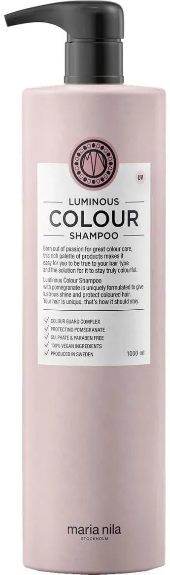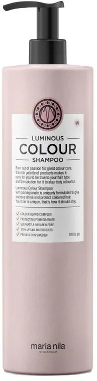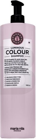 13 Händlerangebote bei billiger.de - Kategorie: Shampoo - Maria Nila - Das Maria Nila Luminous Colour Shampoo - Ein Glanz verleihendes Shampoo für coloriertes Haar, das die Haarstruktur wieder aufbaut und stärkt. Granatapfelextrakt und Colour Guard Complex schützen das Haar und reduzieren Farbverlust aufgrund von Waschen, Hitzestyling und UV-Strahlen. Alle Produkte von Maria Nila Care & Style sind sulfat-und parabenfrei und aus 100% veganen Inhaltsstoffen hergestellt - Der Farbschutzkomplex schützt und bewahrt die Haarfarbe vor dem Verblassen. 'People for Ethical Treatment of Animals' ist die größte Tierschutzorganisation der Welt - PETA prüft unsere Inhaltsstoffe und Produktion, um sicherzustellen, dass Maria Nila 100% vegan und tierfreundlich ist. Unsere Produktentwickler von Maria Nila setzen auf besonders hochwertige Inhaltsstoffe, die den Unterschied für Friseursalons, Kunden, Tiere und die Umwelt ausmachen. - GTIN:7391681036239 ![]() pro- clipper.de Maria Nila Luminous Colour Shampoo 1000 ml MN-3623