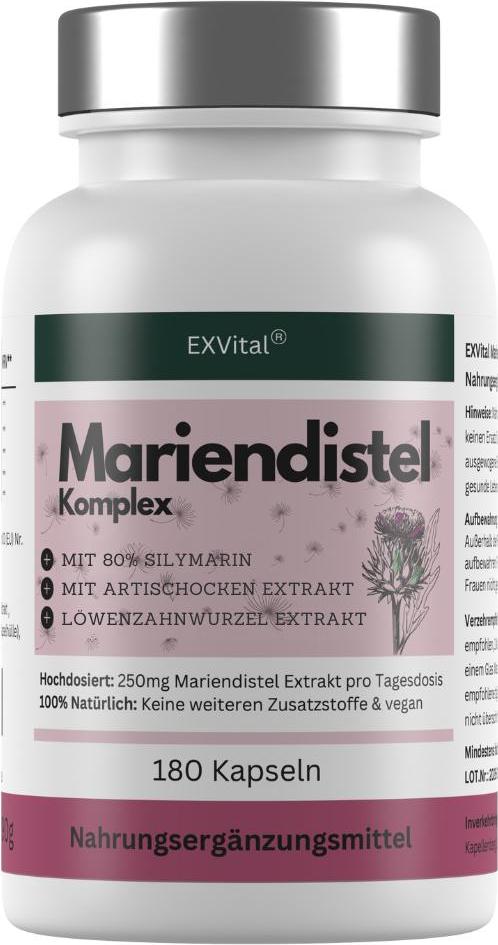 EAN: 4260656131121 - Mariendistel Komplex mit Artischocke & Löwenzahn - 180 Kapseln - Hochdosiert mit 80% Silymarin - 250mg Mariendistel Extrakt pro Kapsel, vegan & ohne ZusatzstoffeEXVITAL MARIENDISTEL KOMPLEX: 1 Kapsel enthält 250mg Mariendistel Extrakt (80% Silymarinanteil), 200mg Artischocken Extrakt & 50mg Löwenzahnwurzel Extrakt. 180 vegane Kapseln reichen für ganze 6 Monate!3-FACHE NATURKRAFT ZUM WOHLFüHLEN: Wertvolle Bitterstoffe sind mit natürlichen Pflanzenstoffen in nur einer Kapsel vereint!VERZEHR: Nur 1 Kapsel täglich unzerkaut mit einem Glas Wasser einzunehmen. Wir empfehlen dir die Einnahme nach einer MahlzeitVEGAN & OHNE ZUSATZSTOFFE: Frei von Aromen, Farbstoffen, Stabilisatoren, laktose- & glutenfrei, frei von tierischen Bestandteilen & ohne GentechnikDEUTSCHES : Höchste Qualität & strengste Kontrollen von der Auswahl der Rohstoffe bis hin zum Endprodukt. Warum ist unser EXVital Mariendistel Komplex so wertvoll? Unser Mariendistel Komplex kombiniert drei kostbare Pflanzenextrakte aus Mariendistel, Löwenzahnwurzel und Artischocke. So wird Deine Körpermitte bereits mit nur einer Kapsel mit wertvollen Bitterstoffen und sekundären Pflanzenstoffen versorgt.Warum sind Bitterstoffe so wichtig für den Körper? Bereits in der Antike wurden Bitterstoffe geschätzt, um die Verdauung zu unterstützen. Leider sind sie heute in vielen Lebensmitteln kaum noch enthalten. Mit unserem EXVital Mariendistel Komplex kannst Du Deine Körpermitte natürlich unterstützen. In welcher ... SUNDAY NATURAL bietet einen großen 6-Monats-Vorrat an veganen Kapseln mit hohem Silymarin-, Cynarin- und Cholin-Anteil, was eine gute Langzeitversorgung gewährleistet. ![]() ![]() SUNDAY NATURAL® Mariendistel Artischocke Löwenzahn Komplex - 180 vegane Kapseln hochdosiert (6-Monats-Vorrat) - Leber Komplex ? 80?% Silymarin, Cynarin & Cholin ? Laborgeprüft, ohne unnötige Zusätze