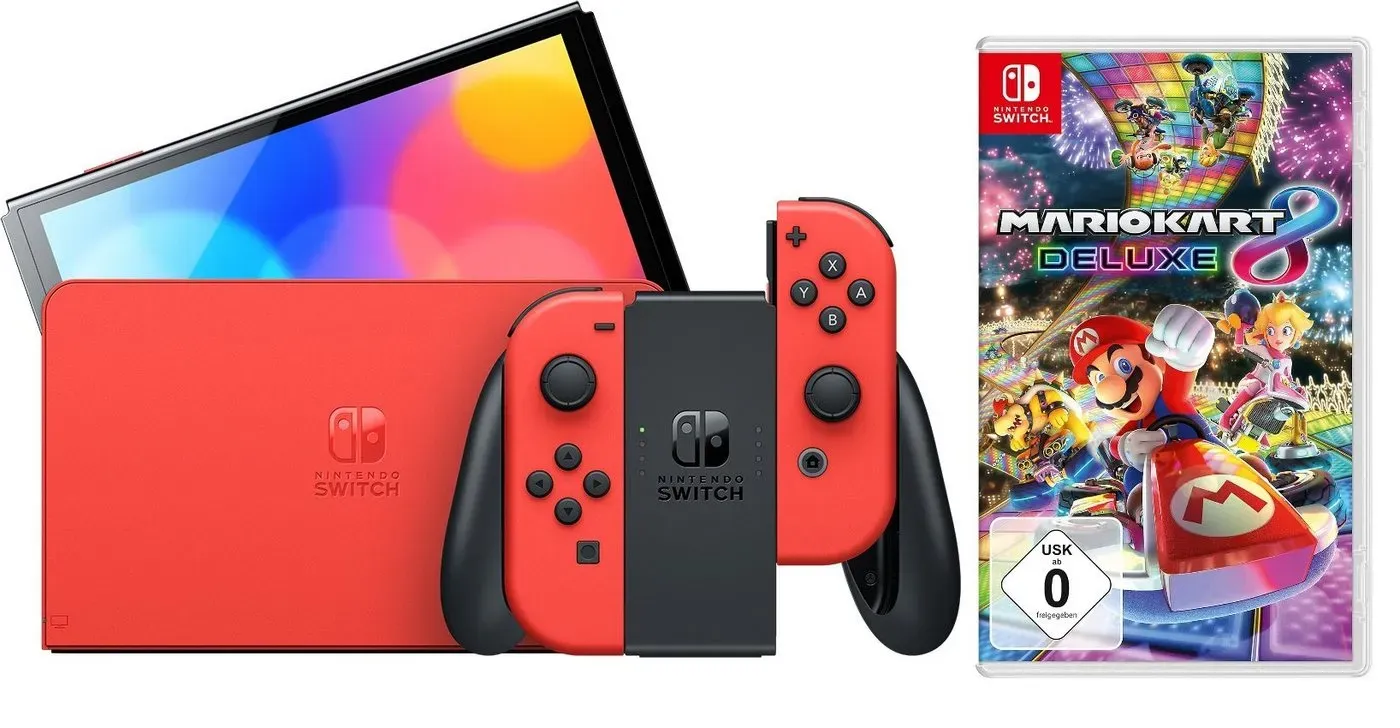 Zustand: Neu - Konsolen Nintendo Switch Konsolen - Nintendo - - - Intensive Farben 7-Zoll-Bildschirm: Nintendo Switch (OLED-Modell) verfügt über einen 7-Zoll-OLED-Bildschirm mit schmalerer Einfassung. Die intensiven Farben des Bildschirms und sein hoher Kontrast liefern ein beeindruckendes Spielerlebnis im Handheld- und Tisch-Modus - egal, ob du mit atemberaubender Geschwindigkeit Rennen fährst oder Gegner in die Flucht schlägst Nintendo Mario Kart 8 Deluxe Switch USK: 0 Inhalt: 1 Stück Set 1 wird am Freitag, den 18.03.2022 veröffentlicht und enthält: – Goldener Turbo-Cup ・ Paris-Parcours (Mario Kart Tour) ・ Toads Piste (Nintendo 3DS) ・ Schoko-Sumpf (Nintendo 64) ・ Kokos-Promenade (Wii) – Glückskatzen-Cup ・ Tokio-Tempotour (Mario Kart Tour) ・ Pilz-Pass (Nintendo DS) ・ Wolkenpiste (Game Boy Advance) ・ Ninja-Dojo (Mario Kart Tour) Die Sets 2-6 werden der Reihe nach veröffentlicht. Weitere Einzelheiten werden zu einem späteren Zeitpunkt bekannt gegeben. - bei Amazon.de Ein Premium-Bundle mit der Nintendo Switch OLED Super Mario Edition in Rot und dem Spiel, für Sammler und Fans. ![]() ![]() Nintendo Switch Konsole OLED Super Mario Edition Rot (Bundle, inkl. Mario Kart 8 Deluxe), Handheld Spielekonsole Bundle Set rot|schwarz