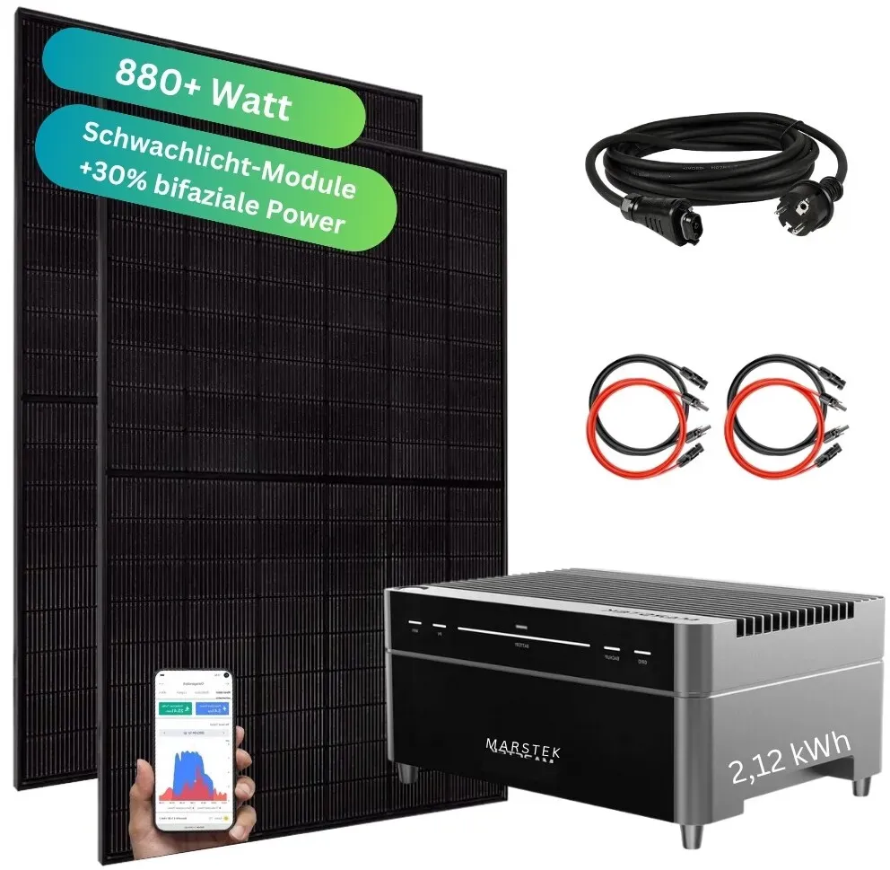 Kategorie: Solaranlagen - dura-solar - Das Set kombiniert die neueste Speicher- und Wechselrichtertechnologie mit hocheffizienten Solarmodulen, perfekt für als Balkonkraftwerk oder für deine bestehende Solaranlage. Im Mittelpunkt steht der Marstek Venus A, ein intelligentes All-in-One-System mit integriertem Akku, Wechselrichter und KI-gestütztem Energiemanagement. Mit einer modularen Speicherkapazität von 2,12 kWh bis 12,72 kWh passt er sich flexibel deinem Bedarf an. Dank der Notstromfunktion mit 1200 W Dauer- und 1440 W Spitzenleistung bleibst du auch bei Stromausfällen zuverlässig versorgt, in unter 15 ms. Die im Set enthaltenen 2 Jolywood JW-HD108N R2-500W Glas-Glas-Module liefern mit ihrer bifazialen N-Type-Technologie höchste Energieerträge. Mit einem Modulwirkungsgrad von bis zu 22,5% und besonders robuster Glas-Glas-Bauweise sind sie auf Langlebigkeit, Effizienz und geringen Wartungsaufwand ausgelegt... - 679,00 Euro bei dura-solar.de - gefunden von billiger.de Dieses Balkonkraftwerk mit 880 Watt und 2,12 kW Speicher ist eine gute Option für kleinere Haushalte oder als Ergänzung. ![]() ![]() MYVOLTAICS Balkonkraftwerk 880 Watt mit Speicher Marstek Venus A 2,12 kW, aufrüstbar, Nulleinspeisung und Notstrom möglich