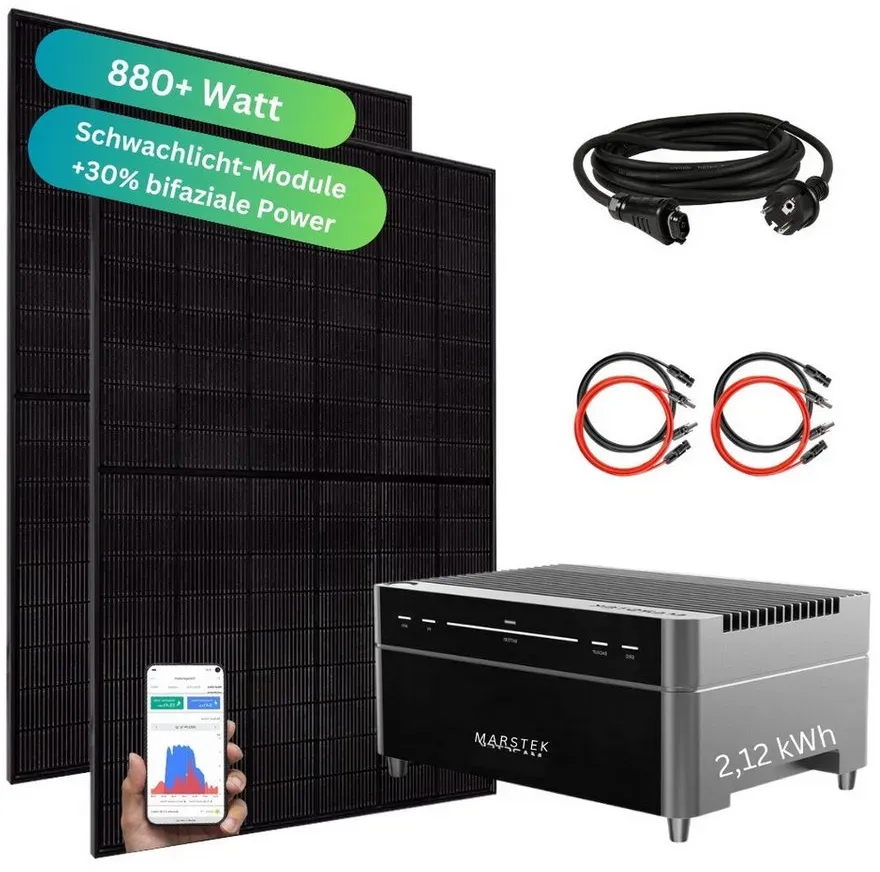 Kategorie: Solaranlagen - dura-solar - Das Set kombiniert die neueste Speicher- und Wechselrichtertechnologie mit hocheffizienten Solarmodulen, perfekt für als Balkonkraftwerk oder für deine bestehende Solaranlage. Im Mittelpunkt steht der Marstek Venus A, ein intelligentes All-in-One-System mit integriertem Akku, Wechselrichter und KI-gestütztem Energiemanagement. Mit einer modularen Speicherkapazität von 2,12 kWh bis 12,72 kWh passt er sich flexibel deinem Bedarf an. Dank der Notstromfunktion mit 1200 W Dauer- und 1440 W Spitzenleistung bleibst du auch bei Stromausfällen zuverlässig versorgt, in unter 15 ms. Die im Set enthaltenen 4 Jolywood JW-HD108N R2-500W Glas-Glas-Module liefern mit ihrer bifazialen N-Type-Technologie höchste Energieerträge. Mit einem Modulwirkungsgrad von bis zu 22,5% und besonders robuster Glas-Glas-Bauweise sind sie auf Langlebigkeit, Effizienz und geringen Wartungsaufwand ausgelegt... - 1189,00 Euro bei dura-solar.de - gefunden von billiger.de Ein Balkonkraftwerk mit 2000+ Watt und 2,12 kWh Speicher, das mit 4 bifazialen Modulen eine hohe Effizienz verspricht. ![]() ![]() MyVoltaics Balkonkraftwerk 2000+ Watt MIT SPEICHER Marstek Venus A 2,12 kWh, Versand 0 , 1200 W, mit 4 Modulen 500+ W bifazial, (Set komplett, 5-St., komplett steckerfertig für Steckdose und Solarmodule, erweiterbar), 800 W Netzausgang, Notstrom direkt am Speicher bis zu 1200 W grau|schwarz