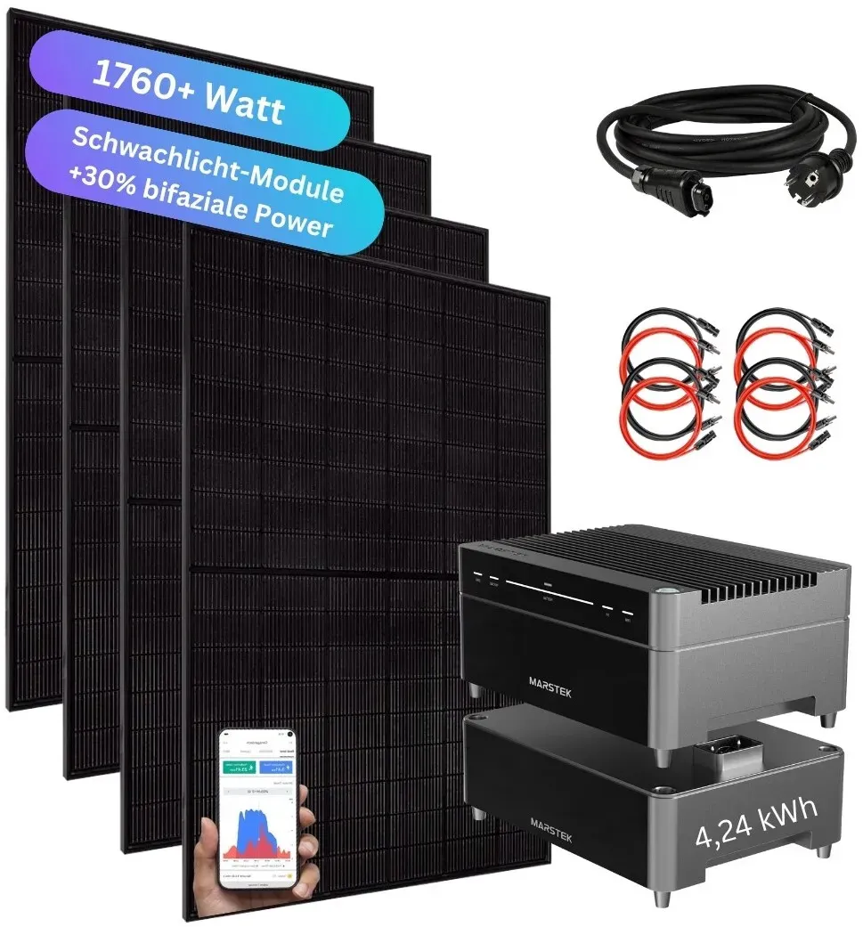 Kategorie: Solaranlagen - dura-solar - Das Set kombiniert die neueste Speicher- und Wechselrichtertechnologie mit hocheffizienten Solarmodulen, perfekt für als Balkonkraftwerk oder für deine bestehende Solaranlage. Im Mittelpunkt steht der Marstek Venus A, ein intelligentes All-in-One-System mit integriertem Akku, Wechselrichter und KI-gestütztem Energiemanagement. Mit einer modularen Speicherkapazität von 2,12 kWh bis 12,72 kWh passt er sich flexibel deinem Bedarf an. Dank der Notstromfunktion mit 1200 W Dauer- und 1440 W Spitzenleistung bleibst du auch bei Stromausfällen zuverlässig versorgt, in unter 15 ms. Die im Set enthaltenen 4 Jolywood JW-HD108N R2-500W Glas-Glas-Module liefern mit ihrer bifazialen N-Type-Technologie höchste Energieerträge. Mit einem Modulwirkungsgrad von bis zu 22,5% und besonders robuster Glas-Glas-Bauweise sind sie auf Langlebigkeit, Effizienz und geringen Wartungsaufwand ausgelegt... - 1589,00 Euro bei dura-solar.de - gefunden von billiger.de Dieses Balkonkraftwerk mit 1760+ Watt und 4,24 kWh Speicher ist eine umfassende Lösung mit Notstromfunktion. ![]() ![]() MyVoltaics Balkonkraftwerk 1760+ Watt MIT SPEICHER Marstek Venus A 4,24 kWh, Versand 0 , 1200 W, mit 4 Modulen 440+ W bifazial, (Set komplett, 6-St., komplett steckerfertig für Steckdose und Solarmodule, erweiterbar), 800 W Netzausgang, Notstrom direkt am Speicher bis zu 1200 W grau|schwarz