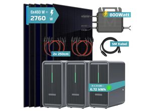 Verfügbarkeit: Gewöhnlich versandfertig in 6 bis 7 Tagen - Kategorie: Solaranlagen - sunniva - GTIN:4255656238666 -  BALKONKRAFTWERK KOMPLETTSET: Mini-PV-Anlage mit 4x 460W bifazialen Glas-Glas Solarmodulen (Pmax 1840W) und 2x Marstek B2500-D (4.48 kWh) Speicher + MST-MI0800 Mikro-Wechselrichter. Direkt über Steckdose anschließbar, sofort nutzbar für Haushaltsgeräte wie Kühlschrank, TV oder Router.  HOHE EFFIZIENZ: Mit 1840W Modulleistung, bifazialen Solarmodulen und Marstek Speicher sorgt diese PV Mini-Anlage für effiziente Energieerzeugung, auch bei schwachem Licht. Ausgangsleistung des MST-MI0800 Wechselrichters: 800W.  HOHE JäHRLICHE EINSPARUNGEN: Durch die hohe Solarmodul Leistung und den hohen Wirkungsgrad des genehmigungsfreien Balkonkraftwerks sparen Sie hohe Stromkosten pro Jahr. Bei steigenden Strompreisen erhöht sich die Ersparnis der steckerfertigen Mini PV Solaranlage.  STABILITäT, SCHUTZ: Die Front aus gehärtetem Glas mit Antireflexbeschichtung und der robuste Aluminiumrahmen sorgen für beste Stabilität des genehmigungsfreien Balkonkraftwerks, auch bei starkem Wind, sowie bei schweren Schneelasten steht die Mini PV Solaranlage sicher. Der Netz- und Anlagenschutz sorgt im Fehlerfall, z.B. bei Netzabschaltung oder Netztrennung, für die sofortige Abschaltung des Wechselrichters und somit des ganzen Balkonkraftwerks.  EINFACHE INSTALLATION: Plug & Play Anschluss der Solarmodule an Marstek ... Dieses große Balkonkraftwerk mit 2760W und drei Marstek Speichern ist eine ausgezeichnete Wahl für maximale Energieunabhängigkeit. ![]() SUNNIVA® 2760W Balkonkraftwerk mit 6,72 kWh Speicher Marstek 3x B2500-D, BIFAZIAL FULLBLACK komplett Steckdose, PV Solaranlage Komplettset mit Solarspeicher, 6x 460W N-Type Glas-Glas Bifacial Module