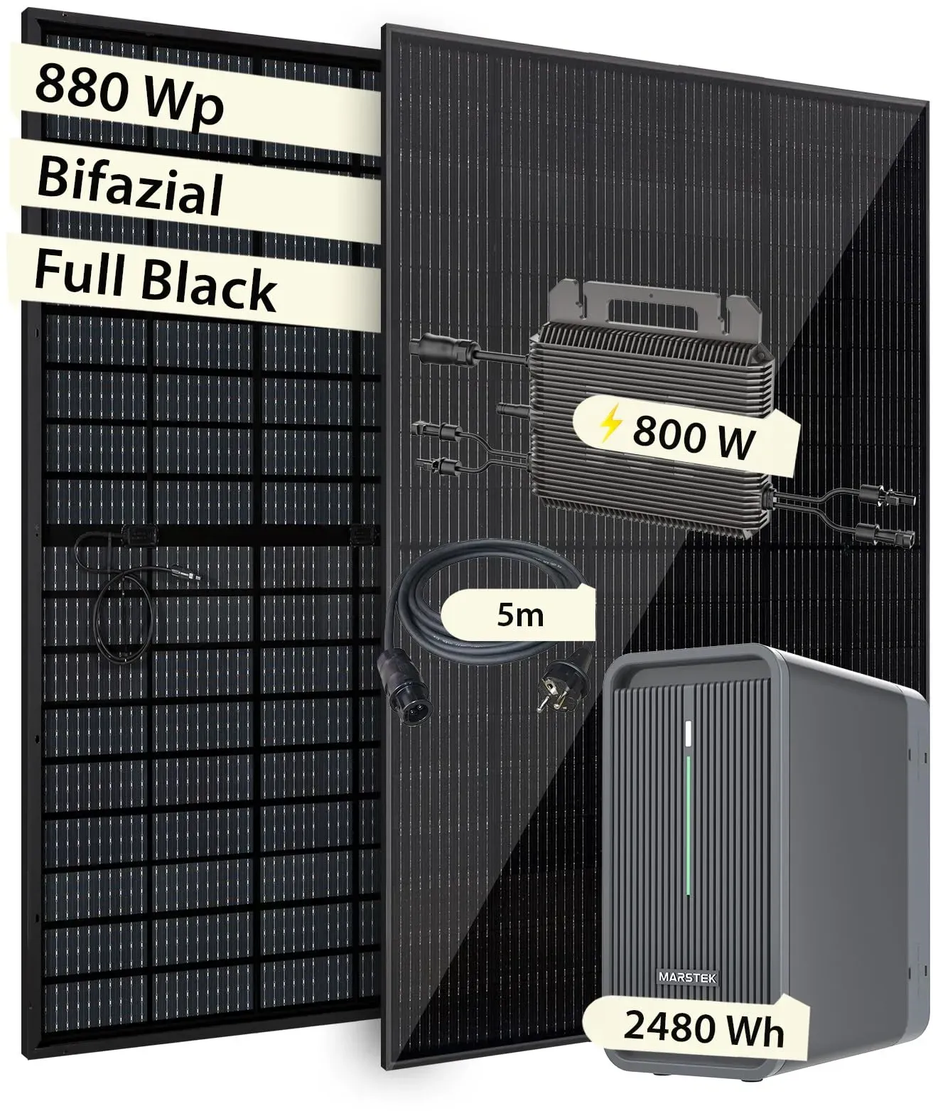 Kategorie: Solaranlagen - Paket.ag - GTIN:0731683425773 - Balkonkraftwerk 880 W Komplettset mit 800 W Wechselrichter & 2,24 kWh SpeicherIhre komplette Solarlösung für Balkon, Terrasse oder Garten! Unser leistungsstarkes 880 W Balkonkraftwerk mit integriertem Stromspeicher ist die perfekte Plug-&-Play-Lösung für sofortige Energieunabhängigkeit. Ideal für Mieter und Eigentümer. Vollständiger Lieferumfang:- 2 x PV-Module BiMAX 5 (440 W, N-Type TOPCon, bifacial, Dual-Glas)Moderne Premium-Module mit beidseitiger StromerzeugungTOPCon-Technologie für hohe Erträge auch bei SchwachlichtLanglebige Dual-Glas-Ausführung mit schwarzem Rahmen- 1 x Marstek Wechselrichter Saturn M (800 W)Hocheffiziente Stromwandlung mit hohem WirkungsgradIntegrierte Sicherheits- und überwachungsfunktionenOptimale Abstimmung auf die Solarmodule- 1 x Stromspeicher (2,24 kWh Kapazität)Moderne Speichertechnologie für flexible EnergienutzungNutzung Ihres Solarstroms auch abends und nachtsErhöht Ihren Eigenverbrauch deutlich- 1 x 5 Meter Schuko-SteckerSofort einsatzbereit für den sofortigen BetriebEinfacher Anschluss an jede Haushaltssteckdose Ihre Vorteile mit diesem Komplett-System:Sofortige Stromkostenersparnis Erhöhen Sie Ihren Eigenverbrauch und senken Sie Ihre monatlichen Kosten Energieunabhängigkeit 24/7 Nutzen Sie Ihren Solarstrom rund um die Uhr, auch nachts Einfachste Installation Vollständig vorkonfektioniert, in 15 Minuten betriebsbereit Höchste Zuverlässigkeit Premium-Komponenten mit modernster ... Dieses Angebot umfasst zwei B2500 Speicher, was eine Verdopplung der Speicherkapazität für größere Anforderungen ermöglicht. ![]() ![]() 2*B2500 Marstek Balkonkraftwerk mit Speicher, 2025 Updated Marstek 2240Wh LiFePO4 Akku 6000 Ladezyklen, Erweiterbar auf 8960Wh, Einfache Installation, IP65,0% MwSt - Nur für Privatpersonen