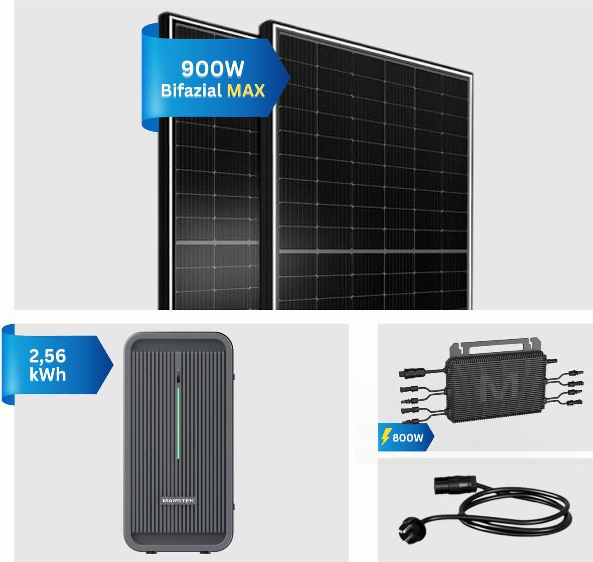 6 Händlerangebote bei billiger.de - Kategorie: Solaranlagen - sunniva - Balkonkraftwerk von SUNNIVA 2760 W / 800 W mit Marstek Solarspeicher 6,72 kWh Das Premium-Balkonkraftwerk mit einer Maximalleistung von 2760 W Pmax vereint den Marstek MST-MI0800 Wechselrichter und 3x B2500-D Solarspeicher in einem perfekt aufeinander a - GTIN:4255656238437 Dieses Balkonkraftwerk-Komplettset ist empfehlenswert für eine hohe Leistung und Speicherkapazität, da es 3x B2500-D Speicher mit 6x 460W bifazialen Modulen bietet. ![]() ![]() SUNNIVA Balkonkraftwerk 2760W mit 6,72 kWh Speicher, (Marstek 3x B2500-D, BIFAZIAL FULLBLACK komplett Steckdose, PV Solaranlage Komplettset mit Solarspeicher, 6x 460W N-Type Glas-Glas Bifacial Module) schwarz
