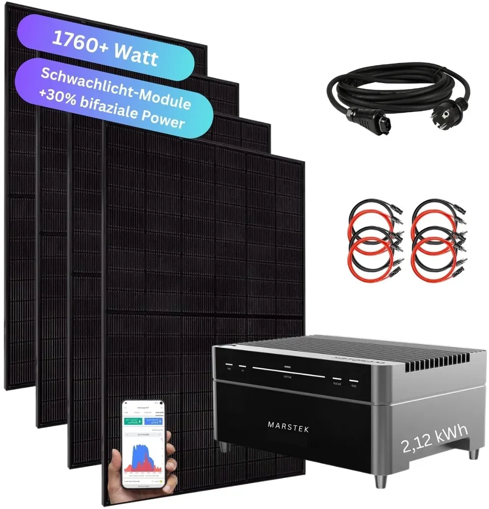 Kategorie: Stromspeicher - Marstek - Leistungsstarkes Balkon-Solar-Speichersystem All-in-One 2,4kW Balkonkraftwerk Speicher. 4-MPPT-Balkon-ESS mit 1,2 kW AC-Kopplung. Vier unabhängige MPPT-Kanäle optimieren die Solarenergie und erfassen bis zu 2400 W effizient. 1200 W bidirektionaler Wechselrichter, Ermöglicht sowohl Netzladung als auch Rückspeisung für flexibles Heim-Energiemanagement. Bietet zuverlässige Notstromversorgung für wichtige Geräte, mit kurzen Spitzenlasten bis 1440 W. Erweitern bis zu 12,72kWh Modulares Batteriesystem, lässt sich bei wachsendem Energiebedarf Flexible Erweiterung bis zu 5 Batteriepackungen bis 12,72 kWh. Ausgehend von einer Kapazität von 12,72 kWh pro Tag und etwa 3816 kWh pro Jahr, bei einem Preis von etwa 0,4 Euro pro kWh. Sie sparen jedes Jahr etwa 1526 Euro. Plug-and-Play, 100 % kompatibel mit Solaranlagen, AC-gekoppeltes Design gewährleistet problemlose Integration in bestehende Solarinstallationen. Keine Notwendigkeit, die bestehende Solaranlage zu verändern. ANTI-ENERGIEVERSCHWENDUNG Hocheffiziente Rückspeisevermeidung mit Smart Meter. überwacht und regelt Energieflüsse automatisch, verhindert unerwünschte Rückspeisung bei präziser Erfassung. Smarte Steuerung mit der MARSTEK-APP. Ermöglicht Echtzeit-überwachung und flexible Modusauswahl für die vollständige Kontrolle über Ihr Heimenergiesystem. Bluetooth-, Wi-Fi- & Ethernet-Unterstützung. Vollhaus-Notstrom mit Smart Box Flexible Notstromlösungen für einphasige (3,6 kW / 38,16 kWh) und ... Dieses Balkonkraftwerk mit 1760 Watt und 2,12 kW Speicher für 1188 Euro bietet eine gute Balance zwischen Leistung und Speicherkapazität. ![]() ![]() MYVOLTAICS Balkonkraftwerk 1760 Watt mit Speicher Marstek Venus A 2,12 kW, aufrüstbar, Nulleinspeisung und Notstrom möglich