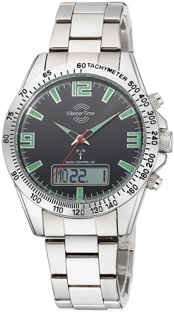 Zustand: Neu - Armbanduhren Armbanduhren für Herren - Master Time - MTGA-10875-32M - EAN: 4260736033789 - Sportliche Funkuhr mit blauem Zifferblatt und Edelstahlarmband mit Sicherheitsschließe, Wasserdicht bis 5 Bar Funkuhr mit digitaler Wochentags- und Datumsanzeige, Stoppfunktion, Funkgesteuerte automatische Zeitumstellung von Sommer- und Winterzeit, Leuchtzeiger Funkuhr mit Langzeitbatterie, 3x längere Lebensdauer als bei einer herkömmlichen Batterie! Empfang des Signals DCF 77 (Mainflingen, DE) Herrenuhr mit silberfarbenem Metallgehäuse, rotem Sekundenzeiger und grünen Stundenmarkierungen Digitale Datumsanzeige mit Datum und Wochentag, Stoppuhr, digitaler Uhrzeit mit Signalempfang - 4 Händler im amazon.de Marketplace Eine robuste Uhr mit Edelstahlarmband, die sowohl analoge als auch digitale Anzeigen bietet. ![]() ![]() Master Time Funk Quarz Herren Uhr Analog-Digital mit Edelstahl Armband MTGA-10874-22M