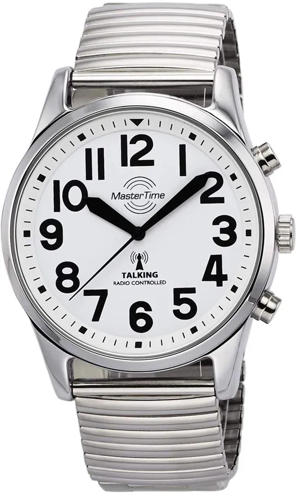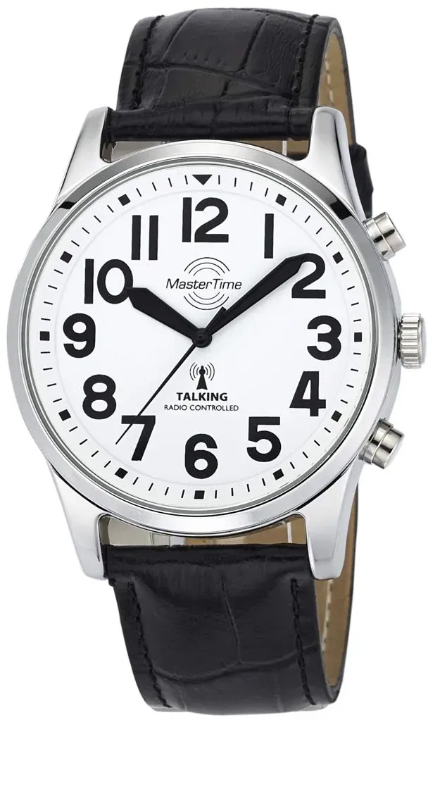 Kategorie: Herrenuhren - Master Time - GTIN:4260736033772 - Sportliche Funkuhr mit schwarzem Zifferblatt und Edelstahlarmband mit Sicherheitsschließe, Wasserdicht bis 5 Bar Funkuhr mit digitaler Wochentags- und Datumsanzeige, Stoppfunktion, Funkgesteuerte automatische Zeitumstellung von Sommer- und Winterzeit, Leuchtzeiger Funkuhr mit Langzeitbatterie, 3x längere Lebensdauer als bei einer herkömmlichen Batterie! Empfang des Signals DCF 77 (Mainflingen, DE) Herrenuhr mit silberfarbenem Metallgehäuse, rotem Sekundenzeiger und grünen Stundenmarkierungen Digitale Datumsanzeige mit Datum und Wochentag, Stoppuhr, digitaler Uhrzeit mit Signalempfang - 59,95 Euro bei Amazon Marketplace Watches - gefunden von billiger.de Eine empfehlenswerte sprechende Uhr mit Lederarmband, ideal für Menschen mit Sehschwäche. ![]() ![]() Master Time Funk Quarz Sprechende Herren Uhr Analog mit Leder Armband MTGA-10690-60L