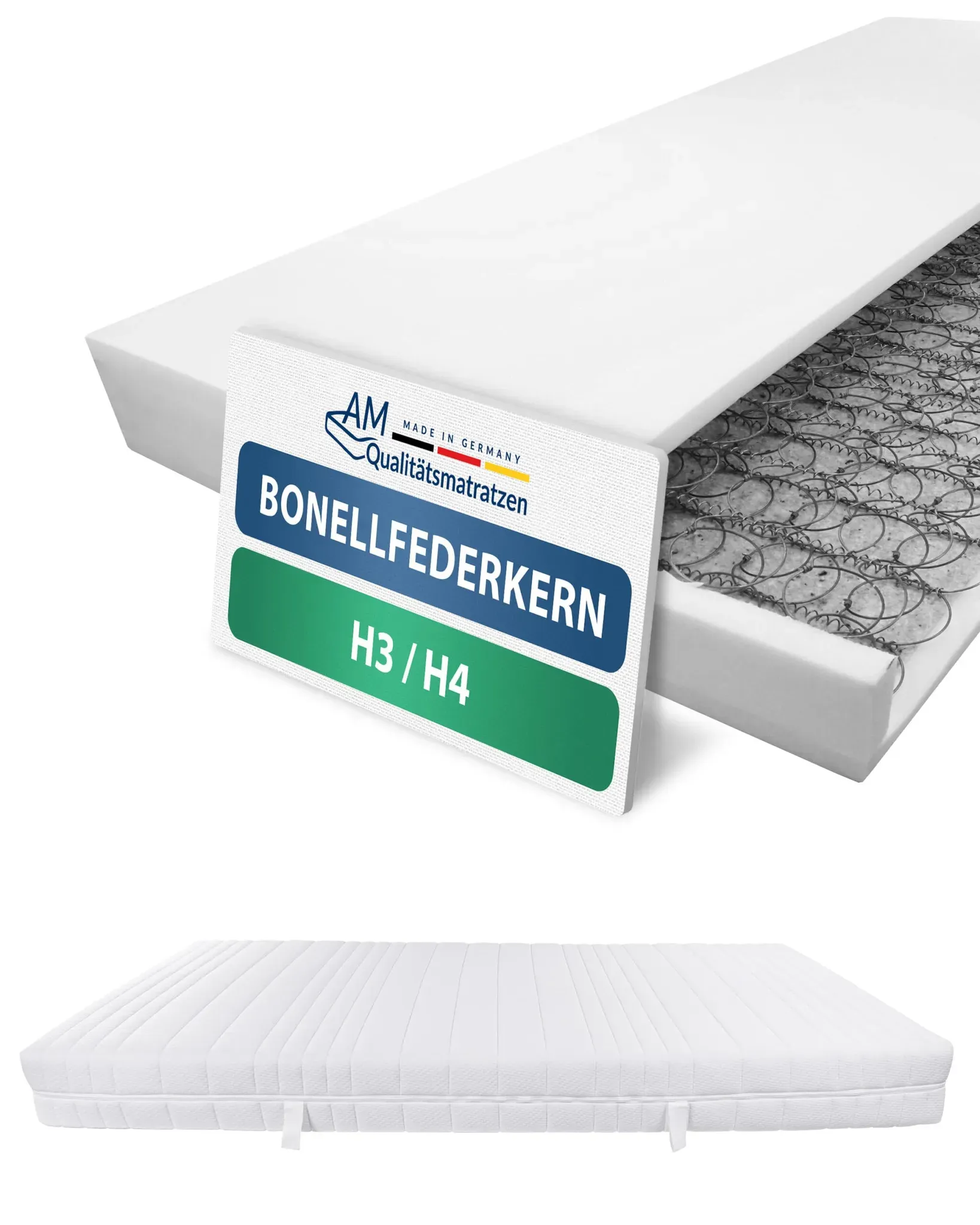 Kategorie: Federkernmatratzen - AM Qualitätsmatratzen - GTIN:4251292774018 - Vielseitige Bonellfederkernmatratze Mit einem 16 cm hohem Federkern, Komfortschaum-Ummantelung und ca. 19 cm Höhe bietet die Matratze bewährten Komfort und ist ein Allrounder für Ihr Schlafzimmer oder ein Gästebett. Flächenelastischer Liegekomfort - Der miteinander verbundene Bonellfederkern passt sich Ihrem Körper gleichmäßig an und unterstützt jede Körperform bis 110 kg. Für erholsamen Schlaf aller Schlaftypen vielfach in Hotels bewährt. Pflegeleichter Klimabezug Der Bezug aus hautfreundlichem Doppeltuch mit versteppter Klimafaser wirkt temperaturregulierend in warmen Sommernächten und hilft nächtliches Schwitzen zu reduzieren. Zertifizierte Qualität Made in Germany - Das OEKO-TEX-Siegel rt Allergikerfreundlichkeit und höchste Produktsicherheit. Unsere Bonellfederkernmatratze 100x200 cm wird vollständig in Deutschland hergestellt. 30 Nächte Probeschlafen Testen Sie unsere Bonell Federkern Matratze 100x200 risikofrei Zuhause bei Nichtgefallen kostenlos abholen lassen und volle Erstattung erhalten. - 189,90 Euro bei Amazon Marketplace Home - gefunden von billiger.de Die Marpur Latexmatratze für 192 Euro bietet eine Kombination aus H3 und H4 Härtegrad und ist Öko-Tex Standard 100 zertifiziert. ![]() ![]() Marpur Latexmatratze, Schwarz, Textil, H3 + H4, 100x200 cm, Oeko-Tex Standard 100, Schlafzimmer, Matratzen Shop, Matratzen