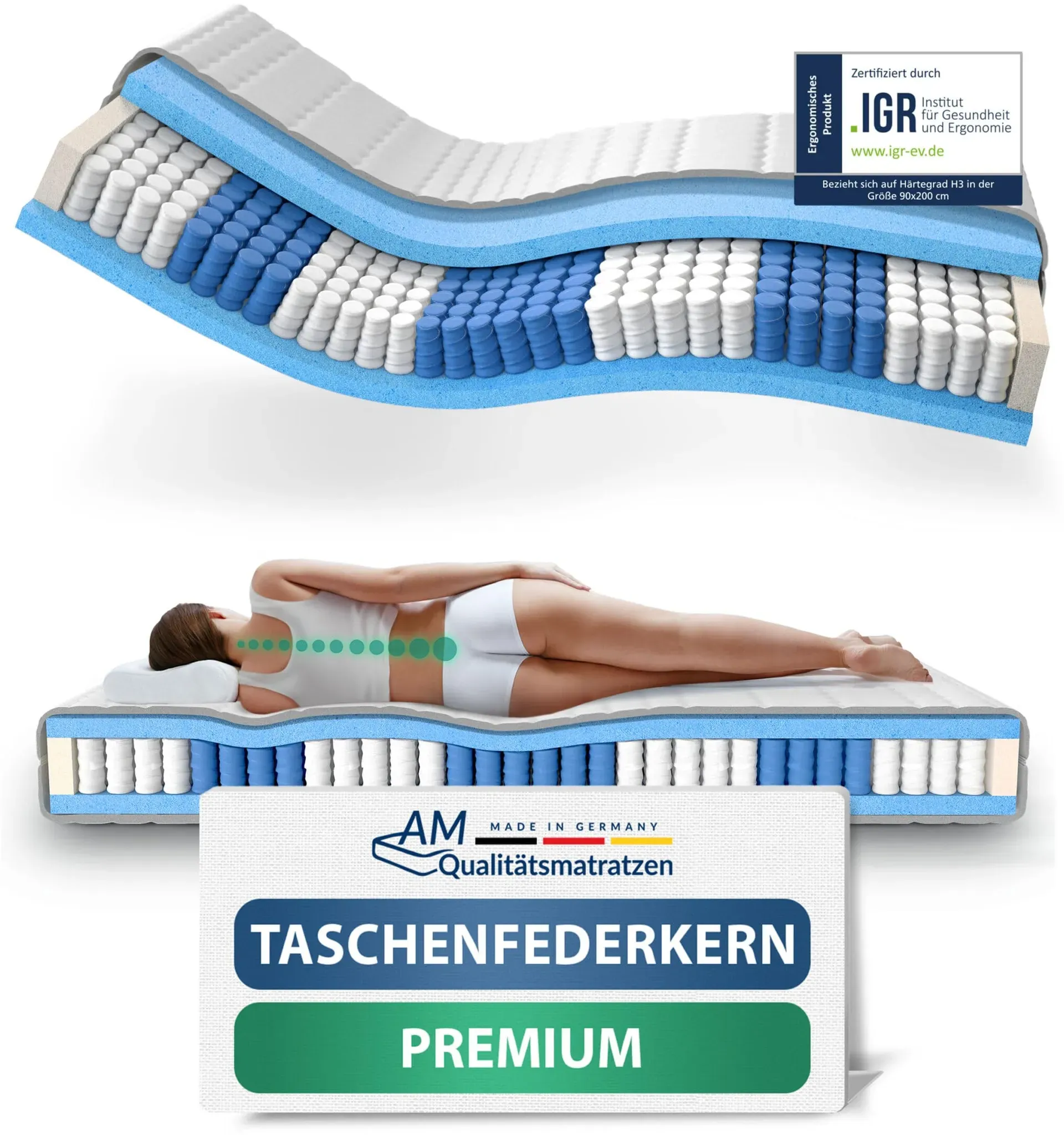 Kategorie: Taschenfederkern-Matratzen - TULENA - GTIN:5901928750778 - Doppelseitiger Komfort: TULENA NOX bietet zwei Liegehärten für individuellen Komfort weicher oder fester liegen, alles auf einer Federkernmatratze! Atmungsaktiver Microfaser Bezug: Abnehmbar und bei 40 waschbar. Bietet den Allergikern Schutz vor Hausstaub und Milben. Der dreiseitige Reißverschluss erleichtert das Aufziehen. Nicht für den Trockner geeignet. Erhältlich in drei Ausführungen: Basic: Bietet grundlegenden Komfort. Comfort: Mit zusätzlicher Memory-Schaum-Schicht für erhöhten Komfort. Comfort+: Mit Memory-Schaum- und Latex-Schicht für maximalen Komfort. Umweltgerechte Verpackung: Volumenreduzierte Rollmatratze soll nach dem Auspacken 72 Stunden warten, um volles Volumen zu erreichen. Nicht länger als vier Wochen komprimiert lassen. 30 NäCHTE TESTSCHLAF überzeugen Sie sich selbst: Testen Sie unsere Matratze 30 Nächte risikofrei. Sollte sie Ihnen nicht zusagen, holen wir sie kostenfrei ab und erstatten den gesamten Kaufbetrag (nur in DE & AT) - 244,40 Euro bei Amazon Marketplace Home - gefunden von billiger.de Diese Premium Taschenfederkernmatratze ist mit 314,90 Euro eine hochwertige Option, die in Deutschland hergestellt und Öko-Tex zertifiziert ist. ![]() ![]() AM Qualitätsmatratzen AM Qualitätsmatratzen Premium Taschenfederkernmatratze 100x200cm H5 24cm - Made in Germany & Oeko TEX Siegel - 7 Zonen Federkernmatratze 100x200 mit Lyocell Bezug - Orthopädische Matratze 100x200 H5