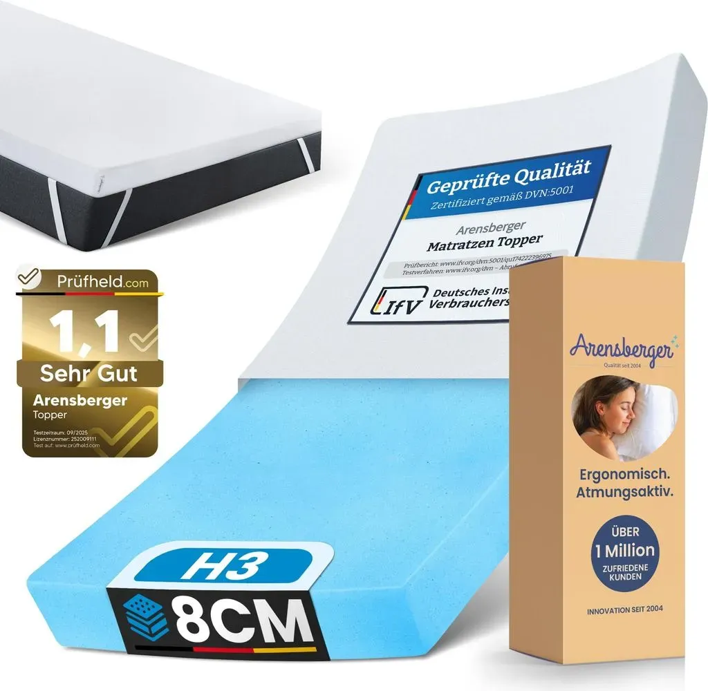 Beliebte Marken und ModelleEs gibt viele Marken und Modelle auf dem Markt, aber einige der bekanntesten sind nicht spezifisch in den Suchergebnissen genannt. Beliebte Marken könnten jedoch Ravensberger Matratzen oder spezialisierte Anbieter wie YAK Bett sein[4]. PreisbereichDer Preis für Matratzentopper variiert stark je nach Material, Größe und Marke. Im Allgemeinen können Sie mit Preisen zwischen etwa 50 und 200 Euro für einfache Modelle rechnen. Hochwertige Topper können jedoch auch über 300 Euro kosten. Um den richtigen Topper zu finden, können Sie im Meta-Preisvergleich nach spezifischen Modellen suchen, wie z.B. einem Visco-Topper oder einem Orthopädischen Topper. Jetzt live Suche nach matratzen topper starten! Empfohlene Matratzen topper Angebote*Durch Käufe über Links zu Händlern kann diese Website eine Provision erhalten, u.a. durch das eBay Partner Network und das AmazonPartnerNetHier ist eine Auswahl von 15 repräsentativen und empfehlenswerten Matratzentoppern aus der Gesamtliste, die verschiedene Preisbereiche und Typen abdecken: Dieser Kalmuck-Matratzen-Topper ist eine preisgünstige Option für grundlegenden Komfort und Matratzenschutz. ![]() 3pagen.de Kalmuck-Matratzen-Topper 150 x 200 natur biberna