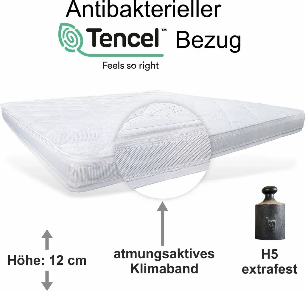 Kategorie: Matratzenschoner - Genius - GTIN:4023012192040 - Exzellentes Schlaferlebnis - Der Gel-Topper aus der TV-Werbung wird auf der vorhandenen Matratze, dem Boxspringbett, dem Lattenrost, dem Gästebett, dem Campingbett u. a. für das Boxspringbett-Feeling platziert und mithilfe von Gummibändern fixiert Druckentlastendes 2-Schichten-System - Die atmungsaktive Visco Auflage besteht aus zwei Schichten und kombiniert Druckentlastung und Stützung zugleich. So unterstützt der Topper die Wirbelsäule vom Kopf bis zum Becken Keine Schmerzen mehr - Verringerung der Druckpunkte an Schulter, Hüfte und Knie (Gelenkentlastung) und optimaler Druckausgleich durch verbesserte Auflagefläche. Sie eignen sich für empfindliche Menschen jedes Alters, Schlaftyp oder Statur und sind zusätzlich Oeko-Tex 100 + Certipur getestet Für Babys und Allergiker geeignet - überzug mit OptiAir Steppung und Klimaband für eine verbesserte Luftzirkulation und somit ein optimales Hautklima. Sehr gute Feuchtigkeitsregulierung: Reguliert die nächtliche Transpiration (nächtliches Schwitzen Einfache Reinigung - Der Bezug ist dank des Reißverschlusses maschinenwaschbar bei bis zu 60 C und trocknergeeignet. Härtegrad: 2 3, geeignet für 60 110 kg Körpergewicht - 120,00 Euro bei Amazon Marketplace Home - gefunden von billiger.de Der marpur Matratzentopper TOP5 aus Latex bietet eine mittelfeste Unterstützung und ist eine gute Wahl für Naturlatex-Liebhaber. ![]() ![]() marpur Matratzentopper TOP5, Latexauflage Größe: 80x200x5, ink. Bezug, Matratzen Topper Frabe: Weiß, mittelhart: H3