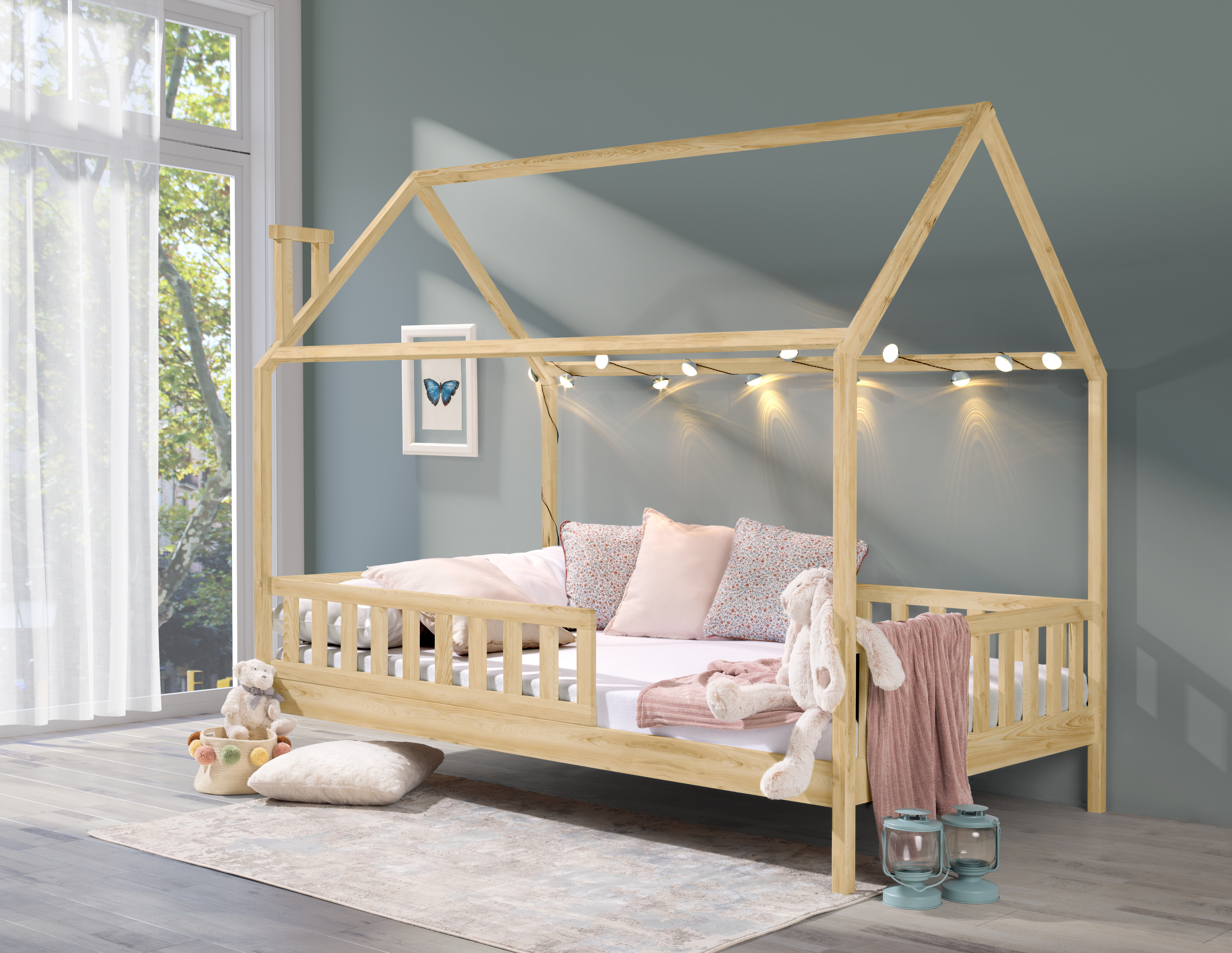 EAN: 5905529610561 - HAUSBETT ZUM SCHLAFEN. Die kindliche Form ist eine ausgezeichnete Auswahl für Kinder. Unser Hausbett dient sowohl als bequemer Schlafbereich als auch als Platz zum Spielen.BETTRAHMEN AUS HOLZ. Bettrahmen aus Kiefernholz für verbesserte Stabilität und Haltbarkeit. Belastbarkeit: 120 kg.UMWELTFREUNDLICH.KLASSISCH: Die Farbe ist klassisch weiß, modern und schlicht. Das ROSI Bett passt zu jedem Einrichtungsstil und ist eine gängige Wahl für Jungen und Mädchen.LIEFERUMFANG: Hausbett aus Kiefernholz, Lattenrost aus Kiefernholz, Rausfallschutz (abnehmbar), Matratze ( Kaltschaum 11 cm ) , ohne Dekoration.Das ROSI Bett wird aus nur hochqualitativen Materialien europäischer Herkunft hergestellt. Das moderne Hausbett im skandinavischen Still schafft ein tolles Wohnambiente in jedem Kinderzimmer. Dank den stabilen Pfosten ist die Bettkonstruktion stabil. Das Hausbett wurde aus massivem Kiefernholz angefertigt und besticht durch seine sichtbare Holzstruktur und Wärme des Materials. Die besondere Herstellung aus hochqualitativen Materialien sorgt dafür, dass das von uns ne Bettchen sehr robust und stabil ist. Die Belastbarkeit beträgt 120 kg. Sie können problemlos auf dem Bett sitzen oder sogar auch mit dem Kind liegen. Dank einem stabilen abnehmbaren Rausfallschutz wird Ihr Liebling während des Schlafs oder des Spieles geschützt. Den Rausfallschutz kann man sowohl links als auch rechts aufbauen. - bei kaufland.de - aus Yadore Produktdaten Dieses Hausbett für Kinder in Grau ist eine praktische und stilvolle Lösung, die bereits Matratzen und Lattenrost enthält. ![]() kaufland.d e LW Hausbett Kinderbett ROSI PLUS 120x200 Grau (Einzelbett inkl/ Matrazen , Lattenrost und abnehmbarem Rausfallschutz)
