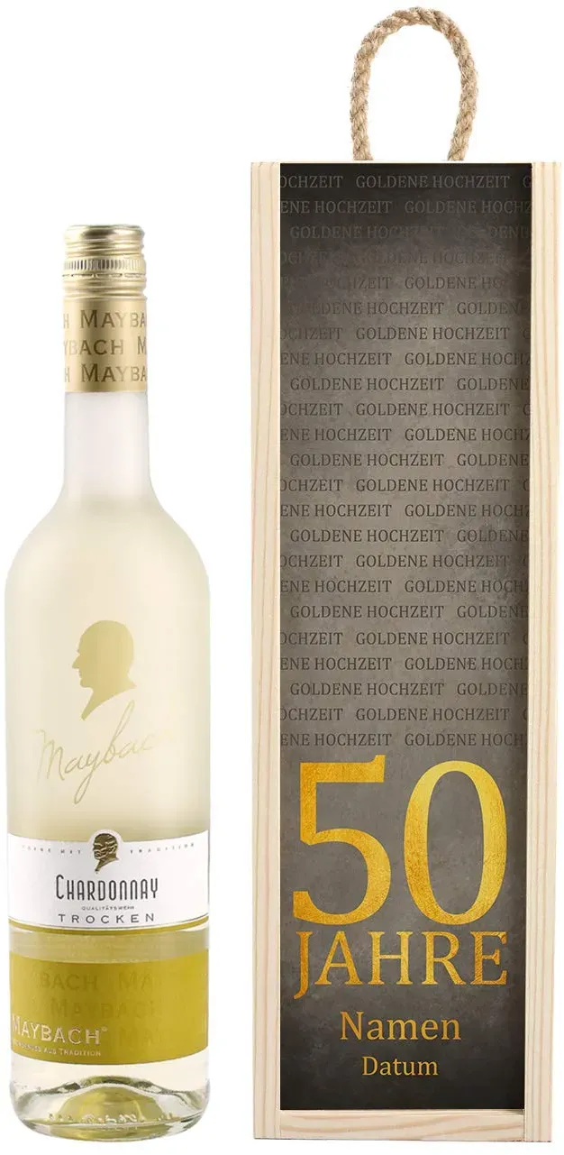 Zustand: Neu - 4,00 € / l - Weißwein - Maybach Weinkellerei Peter Mertes KG, D-54470 Bernkastel-Kues - 16232001 - EAN: 4003301084294 - Weißwein Geschmack: Apfel, Mandel Passt zu: Helles Fleisch, Weichkäse item_display_volume: 1200.0 - bei Amazon.de Dieses personalisierte Maybach Wein-Geschenk zur Goldenen Hochzeit ist eine sehr persönliche und festliche Geschenkidee. ![]() ![]() Herz & Heim Maybach Wein-Geschenk zur Goldenen Hochzeit mit personalisierter Weinkiste - Weißwein zur Auswahl Chardonnay