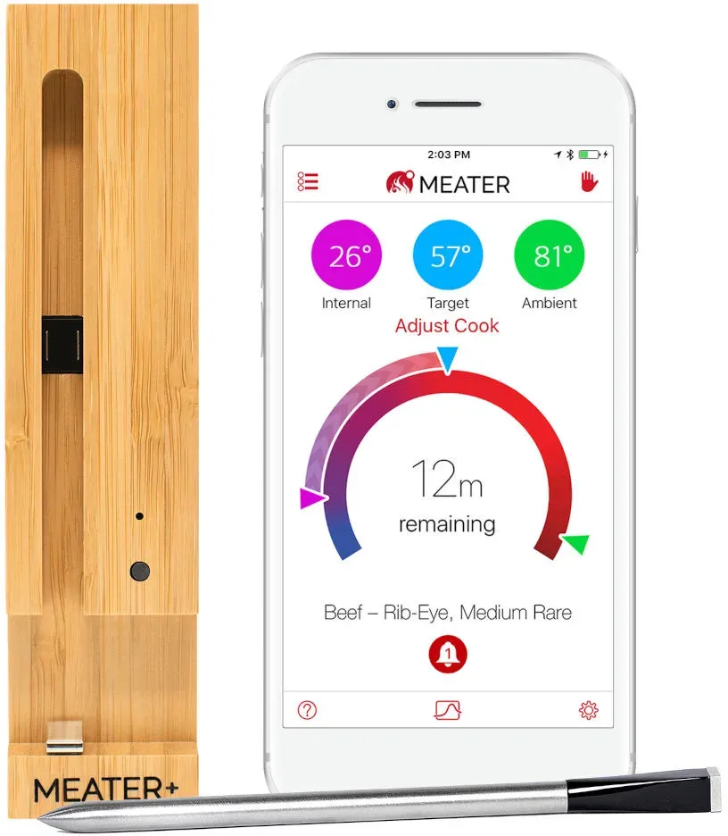 EAN: 5060480243514 - Die Vorteile des Meater 2 Plus - Smartes Fleischthermometer im überblick: Kabelloses smartes Fleischthermometer Perfekte Ergebnisse dank integrierter Kochhilfe Bis zu 75 Meter Reichweite via Bluetooth Geeignet für Ofen, Grill, Pfanne & mehr Clevere Ladestation inklusive Bequeme überwachung mit der Meater App - bei tink.de - aus Yadore Produktdaten Für 99 Euro erhalten Sie hier das Meater Plus mit 50m Reichweite und App-Unterstützung, was ein Standardangebot darstellt. ![]() ![]() MEATER Plus | Das Kabellose, Smarte Fleischthermometer mit 50m Reichweite Für Ofen, Grill, Pfanne und Rotisserie Perfekter Fleischgenuss via App in Deutscher Sprache