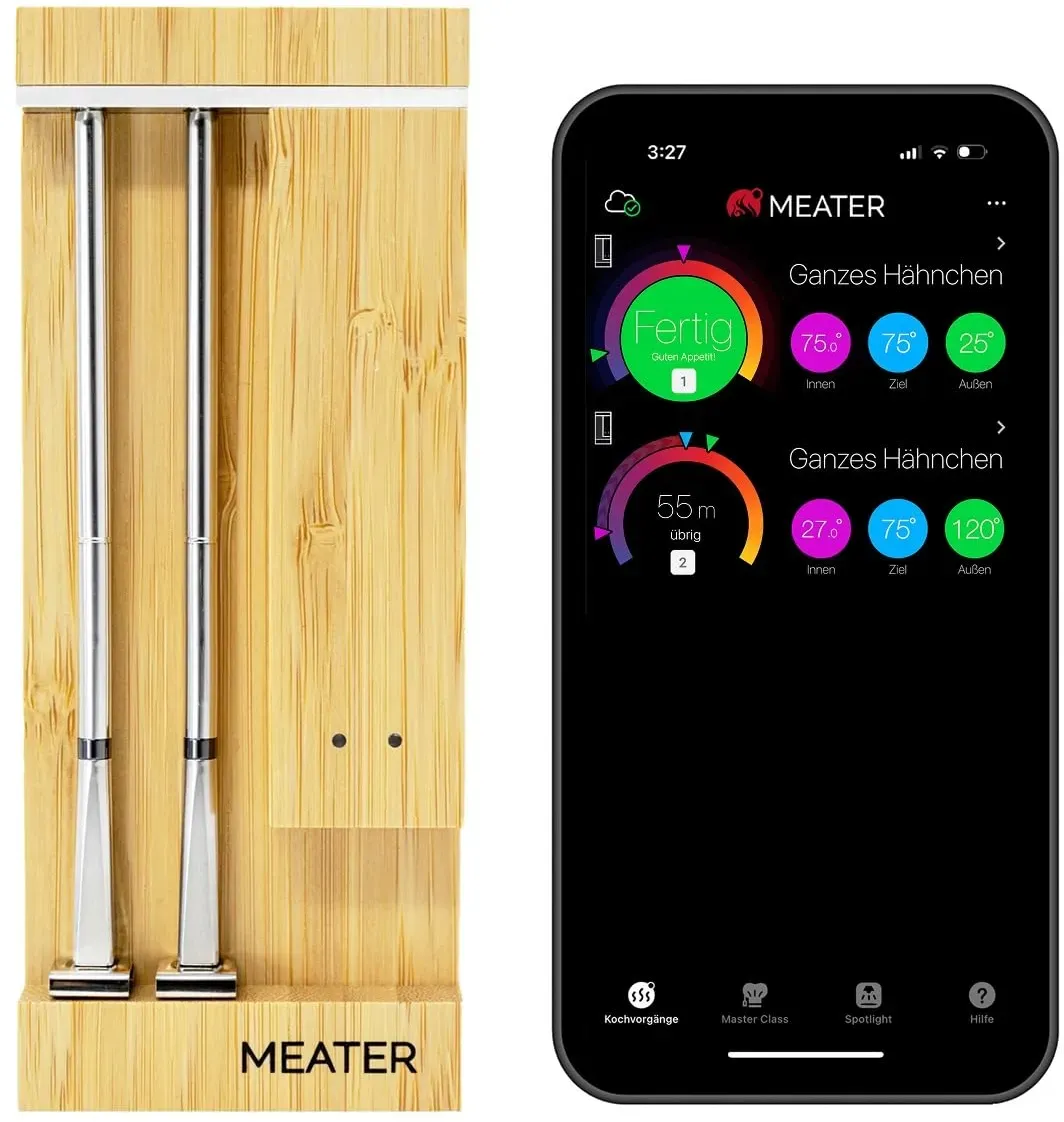 Kategorie: Grillzubehör - MEATER - GTIN:5060480243040 - Vom Outside Magazine zum beliebtesten Fleischthermometer gekürt. Empfohlen von Forbes, NBC, Gizmodo, CNET und anderen. Zwei Sonden / je 6 Sensoren / Hohe Hitze: Fünf interne Sensoren und ein Umgebungssensor in jeder Sonde überwachen gleichzeitig die Kerntemperatur des Fleisches bis zu 105 C und die Umgebungs-/Außentemperatur bis zu 550 C. Ein unverzichtbarer Helfer für Dein Grill- und Küchenzubehör. Kochen mit Anleitung: Führt Dich Schritt für Schritt durch den Kochvorgang und rt so perfekte und gleichbleibende Ergebnisse. Du kannst außerdem benutzerdefinierte Benachrichtigungen basierend auf Temperatur und/oder Zeit einrichten. 100% kabellos: Schluss mit Kabelsalat und eingeschränkter Mobilität. Der MEATER Pro Duo ist komplett kabellos und ermöglicht Dir die überwachung Deiner Kochvorgänge per WLAN. Erhalte Echtzeit-Warnungen und -Benachrichtigungen auf Deinem Smartphone oder Tablet und behalte so jeden Kochfortschritt ganz einfach im Blick. Stelle individuelle Benachrichtigungen und Timer ein. App-Anforderungen: iOS ab Version 15. Android ab Version 8.0. Einfach zu bedienen und zu reinigen: Der MEATER Pro Duo wurde mit dem Ziel der Anwenderfreundlichkeit entwickelt und ist einfach einzurichten und zu benutzen. Er ist wasserdicht, sodass Du ihn beim Sous-vide-Garen verwenden und die Sonden in der Spülmaschine reinigen kannst. Genauigkeit: Die Sensoren wurden im Labor mittels 3-Punkt-Kalibrierung getestet und haben ... Der Meater Block ist eine Premium-Lösung mit mehreren Sonden und integriertem WLAN für maximale Flexibilität. ![]() ![]() MEATER Block | Premium Kabelloses Smart-Fleischthermometer | Ofen Grill Küche BBQ Smoker Rotisserie | Bluetooth und WiFi Digitalverbindung | 50+ Rezepte in der App