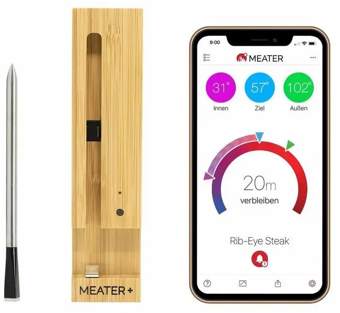 Kategorie: Grillzubehör - MEATER - GTIN:5060480240407 - Verheddere dich nicht länger in Kabeln und nutze das praktische kabellose Fleischthermometer MEATER Plus mit enormer Reichweite. - 79,00 Euro bei garemo.de - gefunden von billiger.de Dieses Meater+ Modell ist ein Bestseller und bietet eine solide Reichweite für die meisten Anwendungen. ![]() ![]() MEATER+ | Neu: Das kabellose, smarte Fleischthermometer mit 50m Reichweite | Für Ofen, Grill, Pfanne und Rotisserie | Perfekter Fleischgenuss via App