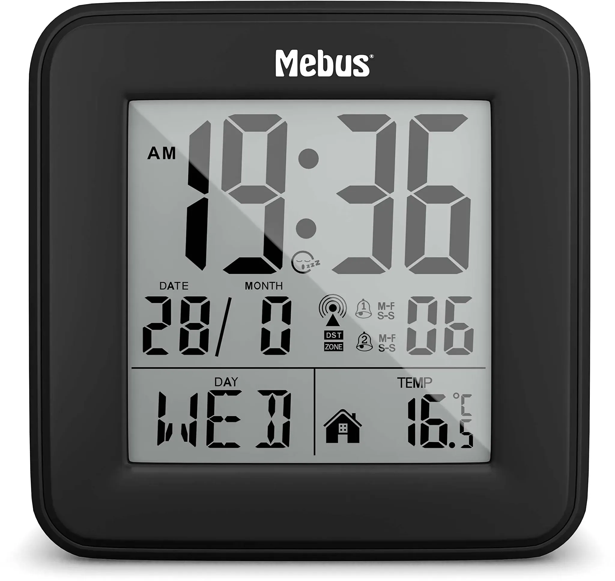 Auf Lager Versand durch AmazonMebus Digitaler Funk-Wecker mit Temperaturanzeige, Beleuchtung, Kalender, kompakt und stabil, Schwarz, Modell: 25594