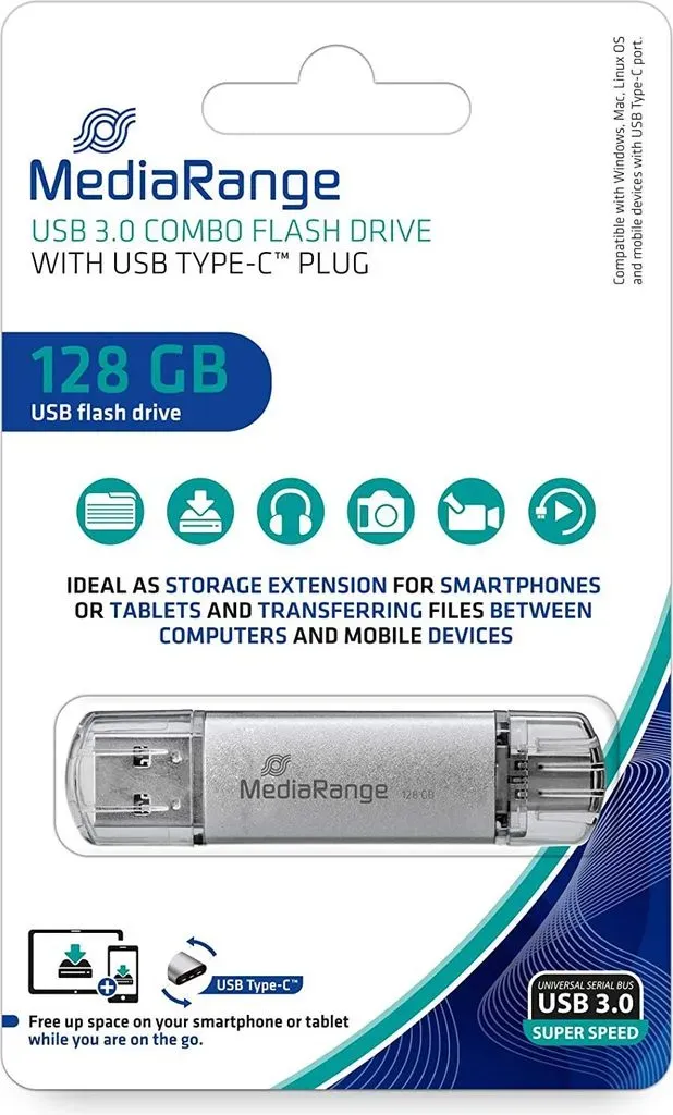 Verfügbarkeit: Auf Lager - Kategorie: USB-Sticks - MediaRange - GTIN:4260283118878 - Externe Speicherplatzerweiterung: USB Speicherstick mit USB 3.0 Anschluss, 128GB Speicherplatz und praktischem Schiebemechanismus und Schlüsselanhänger, ideal als flexibel einsetzbare Speicherplatzerweiterung für mobile Endgeräte Leistungsstarke Performance: Unsere USB 3.0 Speichersticks überzeugen durch eine Spitzen-Lesegeschwindigkeiten von bis zu 80 MB/s und Schreibgeschwindigkeiten von bis zu 25 MB/s Flexible Einsatzmöglichkeiten: Die USB Mini Flash-Laufwerke bieten zusätzlichen Speicherplatz für Daten, Musik, Fotos oder Videos auf Ihren Digitalkameras, Smartphones, Tablet-PCs, Computern oder Musik-Playern Hervorragende Kompatibilität: Der Speicherstick mit USB 3.0 Anschluss ermöglichen blitzschnelle übertragungsraten und eignen sich zur einfachen Verwendung mit allen regulären Geräten mit den gängigen Betriebssystemen Sichere Datenspeicherung: Modernste Flash Technologie, eine langanhaltende Archivierungszeit, sowie das robustes Gehäuse sorgen bei diesem USB-Stick für eine zuverlässige Datensicherung - 11,99 Euro bei Amazon Marketplace CE - gefunden von billiger.de Dieser Kombo-Stick mit USB-C und USB 3.0 ist eine ausgezeichnete Wahl für Nutzer, die beide Anschlusstypen benötigen. ![]() MEDIARANGE MR 938 - USB-Stick, USB 3.0, 128 GB, Kombo USB-C