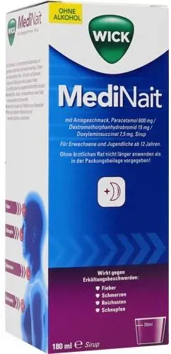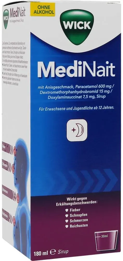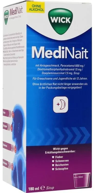 65,83 /l - Kategorie: Arzneimittel - WICK - GTIN:4150141690045 - PZN:14169004 - Das Arzneimittel enthält: Paracetamol, ein bewährtes Schmerzmittel und Fiebermittel. Dextromethorphanhydrobromid, einen Hustenstiller, der am Hustenzentrum wirkt. Er dämpft den Hustenreiz, ohne das notwendige Abhusten zu unterdrücken. Doxylaminsuccinat, einen Wirkstoff, der u. a. Nasenlaufen mindert. Das Präparat wird verwendet zur symptomatischen Behandlung von gemeinsam auftretenden Beschwerden wie Kopfschmerzen, Gliederschmerzen oder Halsschmerzen, Fieber, Schnupfen und Reizhusten infolge einer Erkältung oder eines Grippalen Infekts. - 11,85 Euro bei 089Apotheke - gefunden von billiger.de Dieses Angebot ist das günstigste für Wick MediNait mit Anisgeschmack in der 180 ml GröÃ?e bei Shop-apotheke.com. ![]() Shop- apotheke.c om