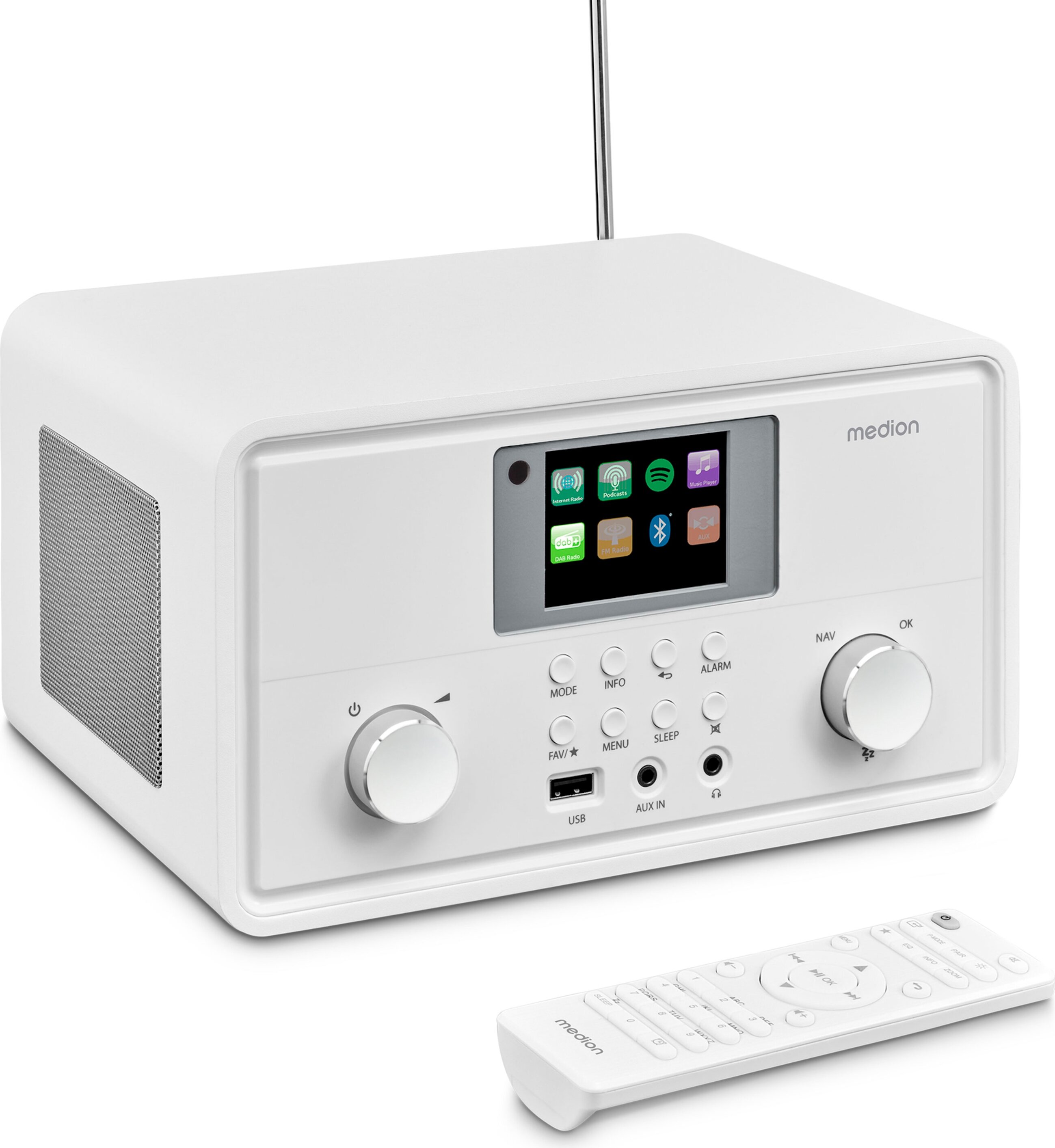 Auf Lager Versand durch AmazonMEDION P85027 Internetradio (DAB Plus, UKW Radio, Spotify Connect, WLAN, Bluetooth, Streaming, Equalizer, Farbdisplay, USB, AUX, Wecker, Schlummerfunktion, Sleep Timer) weiß