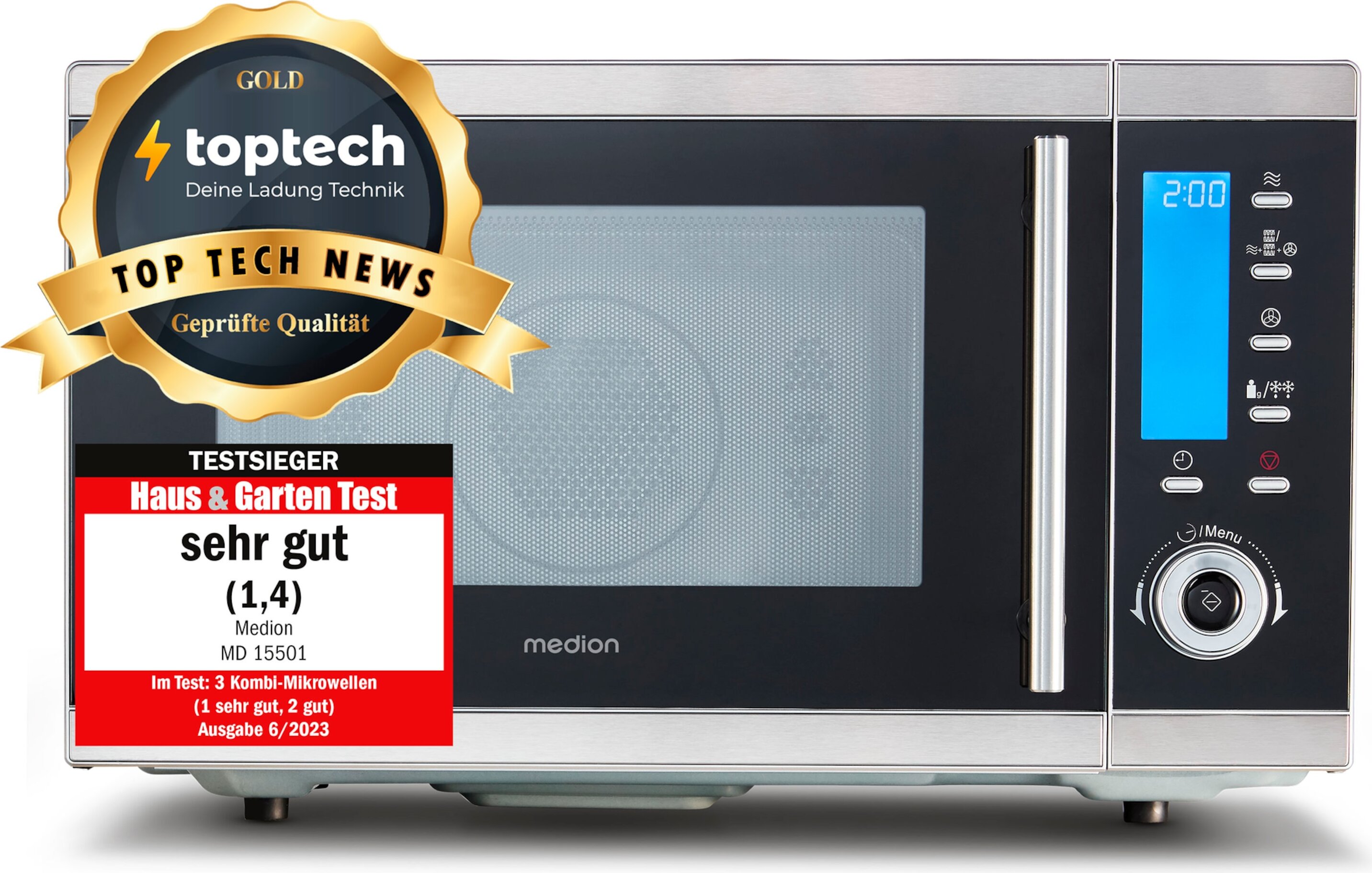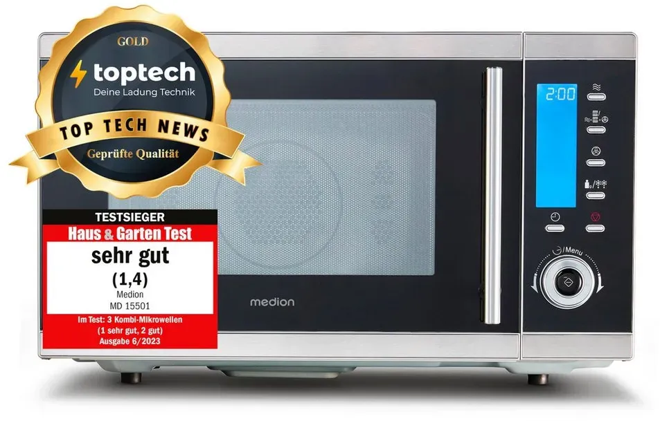 Kategorie: Mikrowellen - Medion - GTIN:4061275025026 - Top-Feature Top-Features , Mikrowellenleistung ca. 900W, Obergrillleistung ca. 1100W, Untergrillleistung ca. 500W, Heißluftleistung ca. 2500W, Garinnenraum ca. 25 L, 10 Mikrowellenstufen (0-100), 10 Heißluftstufen (140 -230 ), 10 Automatik Programme, 3 Grillfunktionen (Obergrill, Untergrill, Doppelgrill), 4 Kombinationsmöglichkeiten (Mikrowelle & Heißluft), Auftaufunktion, 24 Stunden Anzeige im Display, LCD-Display mit blauer Hintergrundbeleuchtung, 95 Minuten digitaler Timer, Koch-Endsignal, Innenbeleuchtung, Kindersicherung, Edelstahlgehäuse, Innenraumabmessungen: ca. 32,8 x 34,6 x 22,6 cm, , Technische Daten Leistung , 2500 W, Handhabung & Komfort Funktionen , Mit Grill Mit Heißluft Digitales Display Mit Timer Mit Backofen Heißluftofen/Konvektomat Auftau-Funktion Aufwärmfunktion Kindersicherung Mit Licht Pizza-Backfunktion, Farbe & Material Farbe , silber, Maße & Gewicht Höhe , 30.5 cm, Breite , 51.3 cm, Gewicht , 18.3 kg, Product Compliance WEEE-Reg.-Nr. DE , 31728250, Produktdetails Modellbezeichnung , MD15501, - 149,95 Euro bei OTTO - gefunden von billiger.de ![]() kaufland.d e MEDION MEDION MD 15501 4 in 1 Mikrowelle mit Grill (25 Liter, 900 Watt, 1100 Watt Grill, 2500 Watt Heißluft, 10 Automatik-Programme) silber MD15501