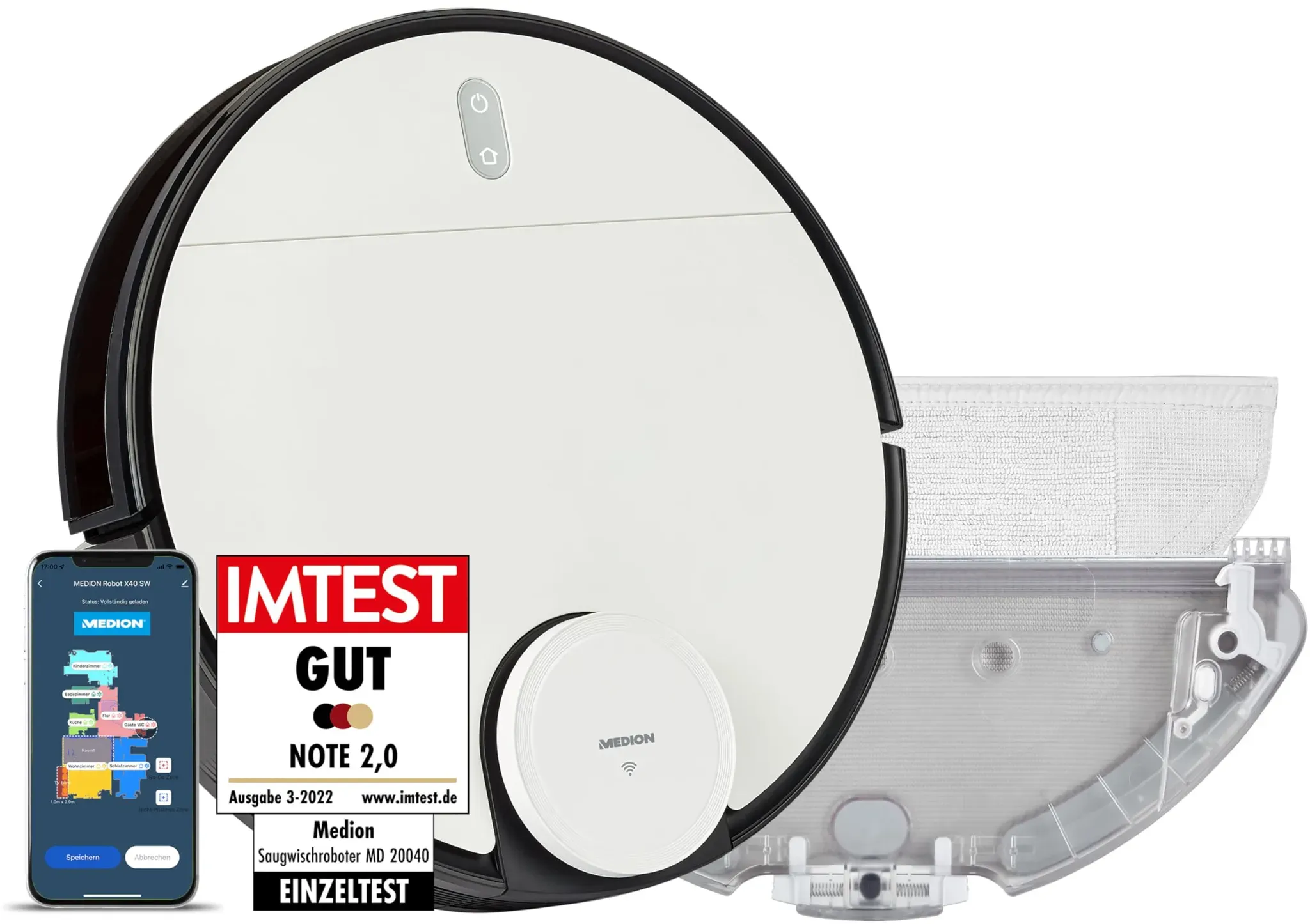 EAN: 4061275177145 - Saugroboter X40 SW (MD 20040) 2in1-Funktion: Saugen & Wischen Alexa, Google & App Steuerung Präzise Lasernavigation und Kartenerstellung Federlagernde Mittelbürste Black-Week-Aktion: Angebot gilt nur solange der Vorrat reicht. - bei cyberport.de - aus Yadore Produktdaten Ein zuverlässiger Saugroboter mit Laser-Navigation, der eine hohe Reinigungsleistung verspricht. ![]() Medion MD 20040 X40 Saugroboter mit Laser Navigation, weiß/schwarz