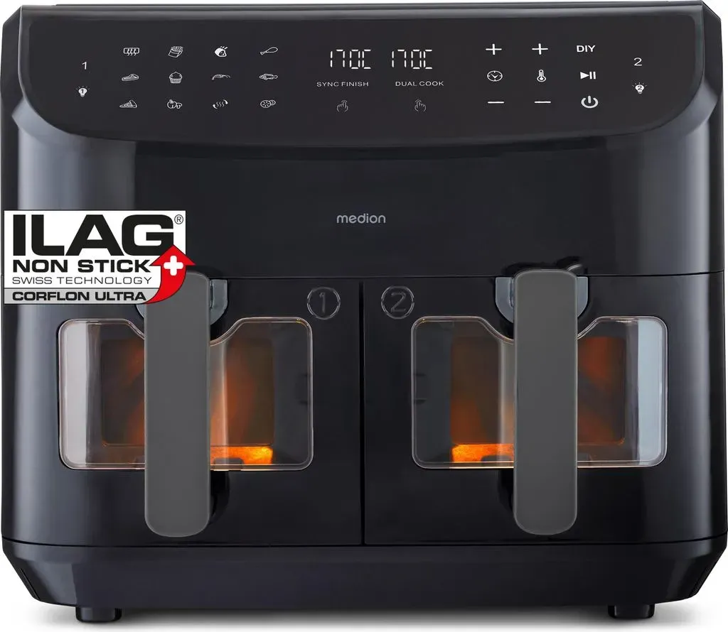 Auf Lager Versand durch AmazonMEDION P10 XL Duo Heißluftfritteuse MD11750 (6,8 Liter XXL, Airfryer, 2.150 Watt, zwei Heizelemente aus Edelstahl, Schüttel Alarm, 9 Automatikprogramme, Touch Bedienfeld, LED Anzeige)