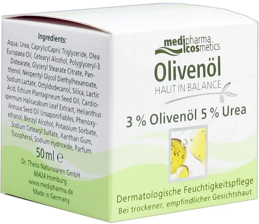 232,60 /l - Kategorie: Medizinische Körperpflege - Medipharma Cosmetics - GTIN:4016369466421 - PZN:07371550 - Raue Haut wird wieder geschmeidig und zartEinzigartige Wirkstoffkombination aus 3 % Olivenöl und 5 % Urea. Die öl-in-Wasser-Pflege ist außerdem angereichert mit pflegendem Panthenol und Vitamin E, raue Haut wird wieder zart und geschmeidig.Frei von Farbstoffen, Silikonölen, Paraffinölen, Wollwachsen und Parabenen. - 11,63 Euro bei medpex.de - gefunden von billiger.de ![]() ![]() Medipharma Cosmetics HAUT IN Balance Olivenöl Feuchtigkeitspflege 50 ml