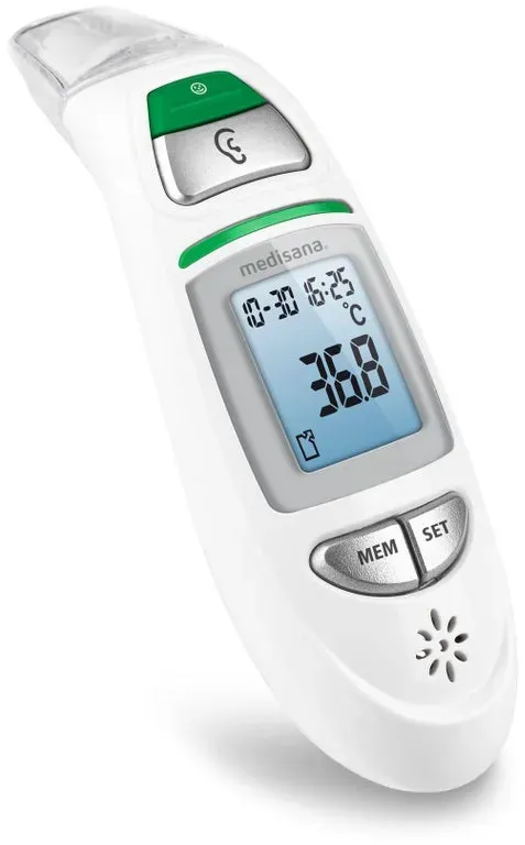 14 Händlerangebote bei billiger.de - Kategorie: Fieberthermometer - Medisana - Infrarot-Multifunktionsthermometer connectMit dem Infrarot-Thermometer TM 750 connect von Medisana können Sie präzise Messungen der Körpertemperatur an der Stirn oder im Ohr vornehmen. Das Multifunktionsthermometer gibt jeweils ein akustisches Signal, wenn es in Messbereitschaft ist und wenn die Messung beendet ist. Präzise, sekundenschnelle Messung von Körper- ObjekttemperaturDie Messung mit dem Infrarot-Thermometer TM 750 wird im Verlauf zwischen Stirn und Schläfe oder wahlweise im Ohr vorgenommen. Das Messergebnis wird innerhalb von wenigen Sekunden angezeigt.Auch zur Messung einer Objekt-Temperatur kann das Infrarot-Thermometer TM 750 verwendet werden, zum Beispiel der Umgebungstemperatur, der Temperatur von Flüssigkeiten oder Oberflächen. Eine Messung in dieser Funktion ist im Bereich von 0 bis 100 Grad Celsius (32 F bis 212 F) möglich. Fieberalarm SpeicherfunktionNeben der digitalen Anzeige aller relevanten Daten bietet es auch einen optischen Fieberalarm durch Farbwechsel: grüne LED-Anzeige = Temperatur noch in Ordnung; rote Anzeige = erhöhte Temperatur gemessen.Besonders praktisch zum Vergleich der Werte und somit zur Beobachtung des Fieberverlaufs ist die Speicherfunktion: Das Infrarot-Thermometer speichert die letzten 30 Messwerte automatisch. Außerdem zeigt es Datum und Uhrzeit an. Des Weiteren ist das TM 750 connect nach der MDD zertifiziert. Technische Daten Größe: ca. 13,4 x 4,2 x ... ![]() ![]() Medisana TM - 750 connect eBay digitales 6in1 Fieberthermometer Ohrthermometer OHNE BOX