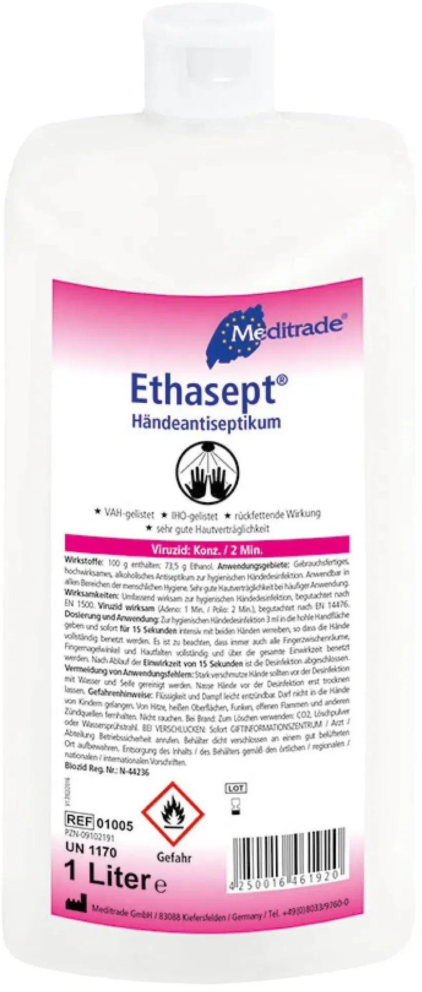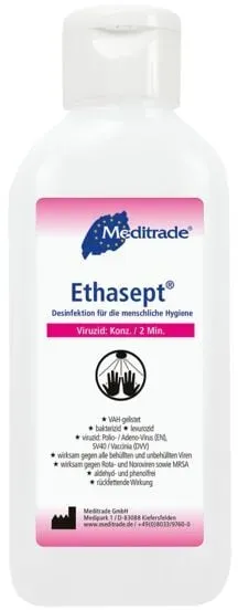 Staubsaugen Reinigen Wohnen Haushalt - - Hände-Desinfektion leicht gemachtDas Meditrade® Desinfektionsmittel Ethasept® ist in medizinischen Einrichtungen nicht mehr wegzudenken. Aber auch in öffentlichen Einrichtungen mit viel Menschenkontakt stellt das Ethasept® eine kluge Investition dar. Schützen Sie sich selbst und Ihre Mitmenschen und nutzen Sie dieses Desinfektionsmittel.Breites WirkungsspektrumDas Desinfektionsmittel ist umfassend und sehr schnell wirksam und entfernt die Störenfriede im Nu von Ihren Händen. Sowohl Kliniken, Praxen, Ambulanzen, Pflegeeinrichtungen als auch öffentliche Einrichtungen und die Lebensmittelindustrie profitieren von dieser Schnelldesinfektion.Schneller EinsatzDas Desinfektionsmittel ist gebrauchsfertig und kann gleich auf den Händen verteilt werden. Ohne Parfüm- und Farbstoffe ist es gut verträglich und kann somit bedenkenlos in Ihre tägliche Hygiene einfließen.Halten Sie Ihre Hände hygienisch sauber und bestellen Sie das Meditrade® Desinfektionsmitteln Ethasept® noch heute hier in unserem Online-Shop.Biozidprodukte vorsichtig verwenden. Vor Gebrauch stets Etikett und Produktinformationen lesen.Bitte beachten Sie die Gefahren- und Sicherheitshinweise:Gefahrenhinweise: - Flüssigkeit und Dampf leicht entzündbar.- Verursacht schwere Augenreizung. Sicherheitshinweise: - Ist ärztlicher Rat erforderlich, Verpackung oder Kennzeichnungsetikett bereithalten.- Darf nicht in die Hände von Kindern gelangen.- Von Hitze, heißen Oberflächen, Funken, ... Eine weitere preiswerte Option für eine 100ml Flasche, perfekt für die Handtasche oder das Auto. ![]() ![]() Meditrade® Ethasept® Desinfektionsmittel 100,0 ml