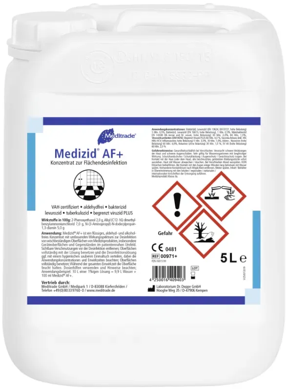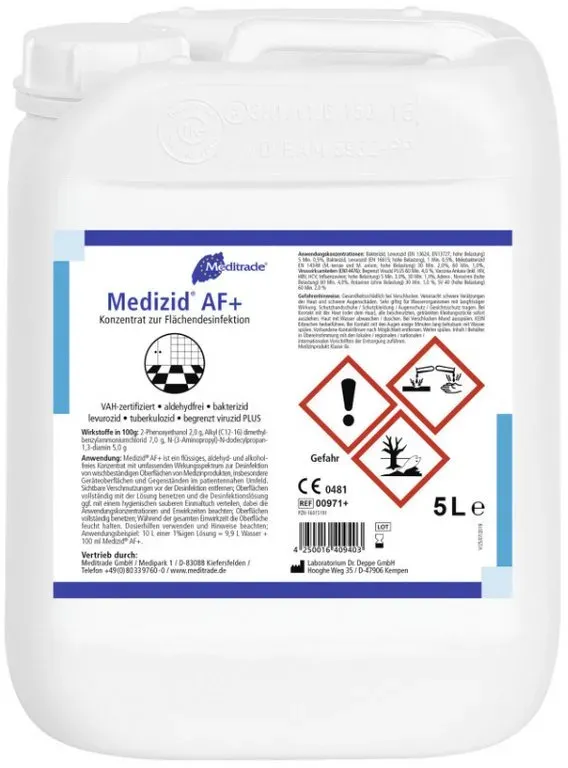 Verfügbarkeit: lieferbar-in 7-9 Werktagen bei dir - Kategorie: Desinfektionsmittel - Meditrade - GTIN:4250016409403 - MediTrade Desinfektionsmittelspender Meditrade Medizid® AF+ Flächendesinfektion 5 Liter, Kanister - 47,64 Euro bei OTTO - gefunden von billiger.de ![]() ![]() Medizid AF+ - - Flächendesinfektion eBay - alkoholfrei - 2 x 5 Liter