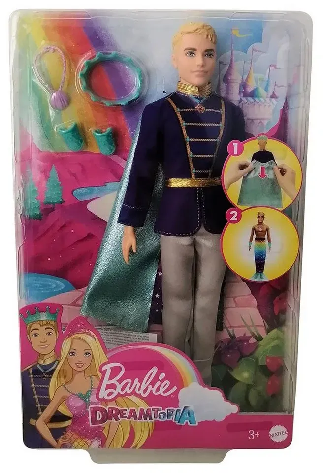![]() ![]() Barbie Meerjungfrauenpuppe Mattel GTF93 Dreamtopia Ken Puppe verwandelbar (Packung, 5-tlg., inkl. Puppenzubehör: 1 Krone, 2 Manschetten 1 Halskette), Verwandalbar von einem Prinzen in einen Meermann bunt