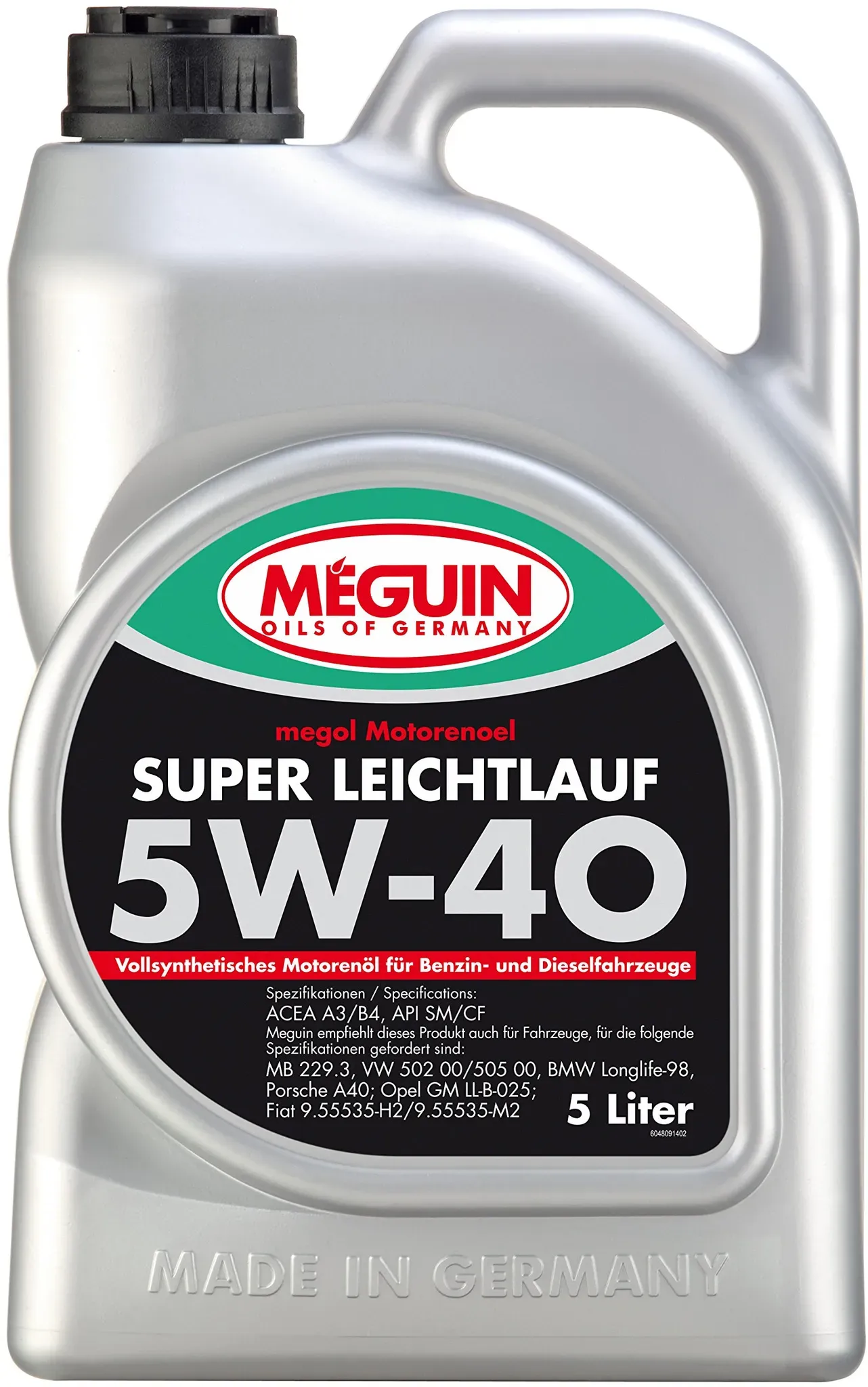 Kategorie: Motoröle - LIQUI MOLY - GTIN:4015838001255 - Spezifikationen/Freigaben: ACEA C3 | API CF/SN | Ford WSS-M2C 917-A | MB-Freigabe 229.31 | Porsche A40 | VW 505 00/505 01 Empfehlungen: BMW Longlife-04 (bis MJ 2018) | Fiat 9.55535-S2 | GM dexos2 | Renault RN 0700/RN 0710 ölart: Synthesetechnologie - 7,19 Euro bei Amazon Marketplace Automotive - gefunden von billiger.de Dieses 1-Liter-Angebot für Meguin Megol Super Leichtlauf 5W-40 ist eine gute Option für den kleinen Bedarf. ![]() ![]() Meguin megol - 5W-40 Super eBay Leichtlauf Motoröl vollsynthetisch 1 Liter VW BMW MB
