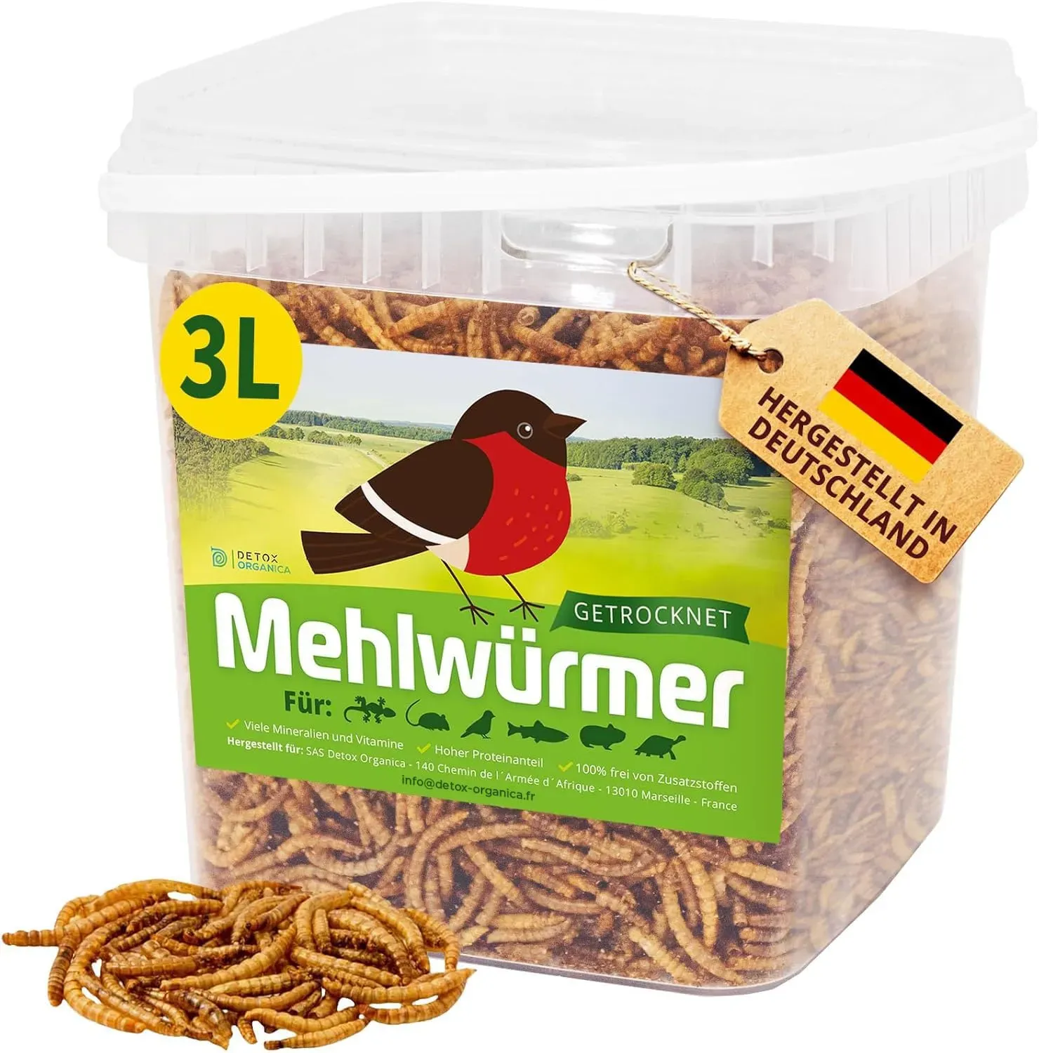 Zustand: Neu - 4,00 € / l - Mehlwürmer Mehlwürmer-Vogelfutter - UGF Underground Food Underground Food s.r.o. - UGF-BR-3000 - EAN: 8594195460944 - 💪 PROTEIN & KALZIUM - Getrocknete Larven der Schwarzen Soldatenfliege bieten gegenüber Mehlwürmern mehrere Vorteile wie Nährstoffdichte, Nachhaltigkeit und Effizienz der Futterverwertung. Daher ist die Larve der Schwarzen Soldatenfliege eine ideale Ergänzung zu einem ausgewogenen Futter für Tiere. 🔠ALLE TIERE - Dieser Insekten Snack ist Futter für Vögel, Igel, Hamster, Ratten, Mäuse, Fische, Koi, Eichhörnchen, Schildkröten und Eidechsen geeignet. 🛠GESUNDES ESSEN - Getrocknete Larven der Schwarzen Soldatenfliege sind reich an Eiweiß, essentiellen Aminosäuren und Fettsäuren. Hoher Calciumgehalt (85X als Mehlwürmer) für starke Knochen und Zähne sowie essentielle Aminosäuren für Muskelwachstum und -reparatur. Die Konsumierung of this getrockneten Würmer verkleinert den Gesamtverbrauch von Tierfutter. 🌿 100% NATÜRLICH - Unser getrocknetes Insekt ist 100% Naturprodukt ohne Konservierungsmittel und Farbstoff. Es ist in einem wiederverwertbaren 3l Eimer verpackt, weswegen den man gut einlagern kann, der stinkt nicht, die Würmer bleiben drin in einem Stück und in der höchsten Qualität. 👨€ðŸ’¼ PREMIUM KUNDENSERVICE - Firma UGF hat viele zufriedene Kunden, von Futtermittelherstellern bis zu Einzel- und Großhändlern für Futtermittel. Wir kooperieren mit Zoos in verschiedenen Ländern, die ihre Tiere mit unseren Produkten ... ![]() ![]() Detox Organica Mehlwürmer Getrocknet, 3L getrocknete Mehlwürmer mit sehr hohem Proteingehalt, Würmer für Reptilien, Vögel, Wildvögel, Igel, Fische, Schildkröten & Nager 460g Premium Qualität