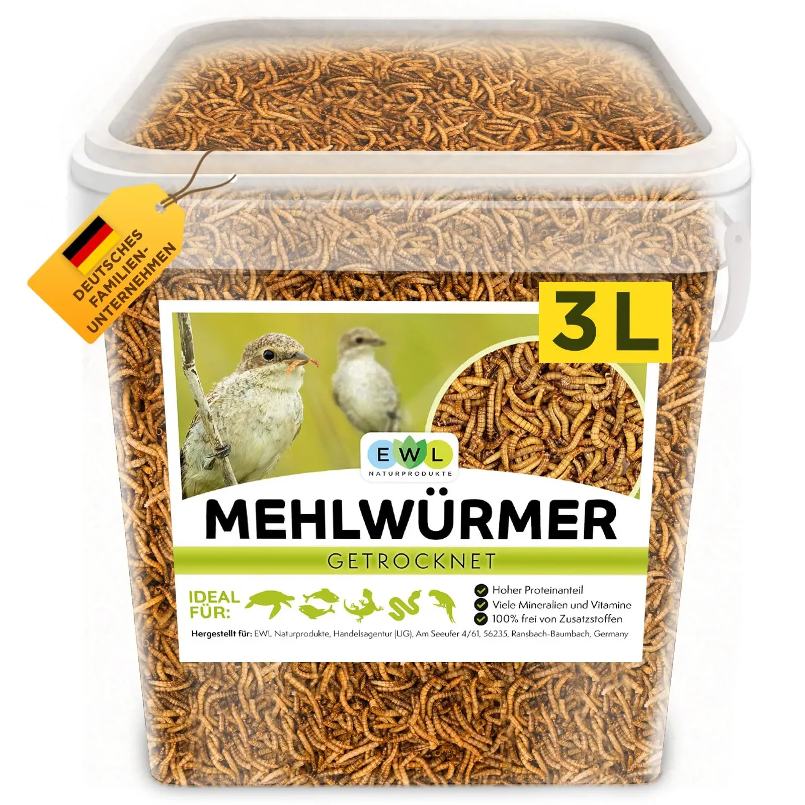 Zustand: Neu - 30,33 € / kg - Futter & Leckereien Futter & Leckereinen für Reptilien & Amphibien - EWL Naturprodukte - TY16 - EAN: 7141235728222 - ðŸ¦QUALITÄT: Unsere Mehlwürmer im 3L-Eimer (460g) werden besonders schonend getrocknet. Anschließend werden sie sorgfältig und bruchsicher verpackt. 🦎LECKERER SNACK: Mehlwürmer getrocknet sind das ganze Jahr über ein optimaler Snack für alle Reptilien, Nager und Fische. ðŸ NATÜRLICH: Unsere Mehlwürmer sind ein reines Naturprodukt und vollkommen frei von Zusatzstoffen. 🢠LEICHT ZU FÜTTERN: Die getrocknete Mehlwürmer lassen sich leicht zerreiben und können so auch an Nager, kleinere Fische und Reptilien gut verfüttert werden. Als Beigabe zum Hauptfutter sind sie ein echter Leckerbissen. 🦔 GUT GEEIGNET: Die Mehlwürmer eignen sich ebenfalls optimal als Schildkrötenfutter, Fischfutter, Igelfutter und Hamsterfutter, sowie ganzjährig als Futter für Wildvögel. - Verkäufer: EWL Naturprodukte im amazon.de Marketplace ![]() ![]() EWL Naturprodukte Mehlwürmer getrocknet 3L, Premium Insektensnack Vögel, Fische, Schildkröten, Nager, Igel, Reptilien, Vogelfutter Wildvögel Ganzjährig Eichhörnchen Futter Hamsterfutter Igelfutter (460g)
