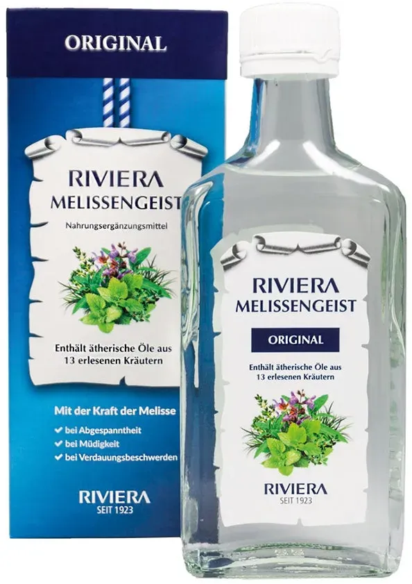 67.88 / l - Kategorie: Nahrungsergänzungsmittel - Klosterfrau - GTIN:4150016657760 - Heilpflanzen: Das Klosterfrau Melissengeist besteht aus 13 ausgewählten Heilpflanzen, die in Ihrer Wirkstoff-Zusammensetzung zahlreiche Beschwerden lindern. Setzen Sie auf die Original-Rezeptur aus 1826 mit natürlichen Heilkräutern. Wirksamkeit: Schonende und effektive Wirkung der natürlichen Heilkräuter bei vegetativen Beschwerden. Klosterfrau Melissengeist stärkt das innere Gleichgewicht, unterstützt die Selbstheilungskräfte und sorgt für ein gesundes Wohlbefinden des Körpers. Innere Anwendung: Trinken Sie diese besondere Naturarznei bei Erkältungssymptomen, Magen-Darm-Beschwerden (z. B. einem Blähbauch), bei innerer Nervosität und bei Schlafstörungen zur Einschlafhilfe als Beruhigungsmittel. äußere Anwendung: Auf der Haut aufgetragen, dient das Heilkraut-Destillat zur Muskelentspannung und lindert Muskelbeschwerden, Muskelkater, Muskelverspannungen, sowie auch Kopfdruck und Gliederschmerzen bei Erkältungen. Bekömmlich: In einem aufwändigen und schonenden Destillationsverfahren wird die besondere Zusammensetzung der 13 Heilkräuter für den Menschen bekömmlich gemacht. Es ist ohne Zucker und Farbstoffe aus 12 kultivierten Heilpflanzen hergestellt. - 22,40 Euro bei Amazon Marketplace Health & Personal Care - gefunden von billiger.de Riviera Original Melissengeist ist eine weitere bekannte Marke, die hier in einer größeren Flasche zu einem guten Preis angeboten wird. ![]() ![]() Hager Pharma Gmbh Riviera Original Melissengeist