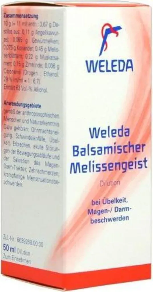24 Händlerangebote bei billiger.de - Kategorie: Arzneimittel - Weleda - Dilution Zusammensetzung 10 g (= 11 ml) enth.: 3,67 g Destillat aus: 0,11 g Angelikawurzel; 0,065 g Gewürznelken; 0,075 g Koriander; 0,45 g Melissenblättern; 0,22 g Muskatsamen; 0,15 g Zimtrinde; 0,006 g Citronenöl [Drogen : Ethanol 29 % (m/m) = 1 : 6,7]. Sonstige Bestandteile: Ethanol 96 %, Gereinigtes Wasser. Anwendungsgebiete Gemäß der anthroposophischen Menschen- und Naturerkenntnis. Dazu gehören: Ohnmachtsneigung, Schwindelanfälle, übelkeit, Erbrechen, akute Störungen der Bewegungsabläufe und der Sekretion des Magen-Darm-Traktes; Zahnschmerzen; krampfartige Menstruationsbeschwerden. Dosierung Soweit nicht anders verordnet, in akuten Fällen 10 20 Tropfen auf Zucker oder mit Wasser verdünnt einnehmen, ggf. auch mehrmals bis zu 5 mal täglich. Bei Zahnschmerzen können auch einige Tropfen in Haut und Zahnfleisch eingerieben werden. Warnhinweis Enthält 63 Vol.-% Alkohol. - GTIN:4001638099844 - PZN:01441798 Dieses Angebot von Klosterfrau Melissengeist in einer gängigen Größe ist ein solider Mittelweg für den täglichen Bedarf. ![]() ![]() Klosterfrau Melissengeist 235 ml