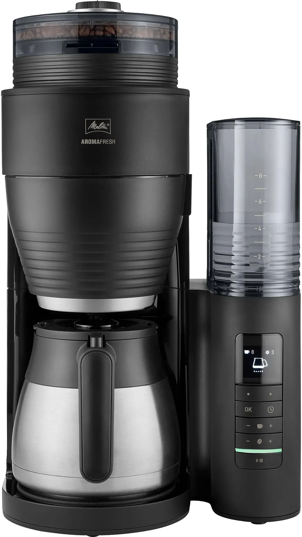 Auf Lager Versand durch AmazonMelitta AromaFresh Therm Pro X ? Filterkaffeemaschine mit integriertem Mahlwerk, entnehmbarem Wassertank, Edelstahl-Thermkanne und Timer-Funktion, für bis zu 8 Tassen Kaffee, in Schwarz/silber