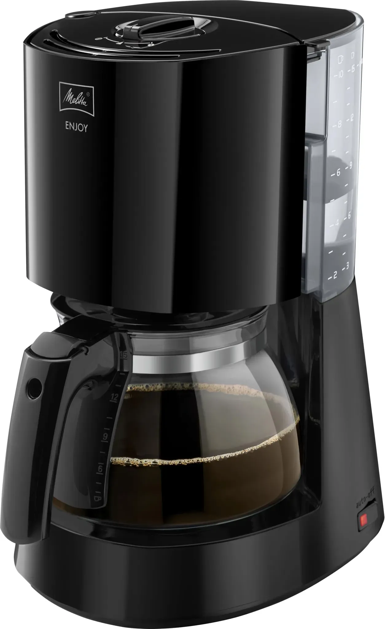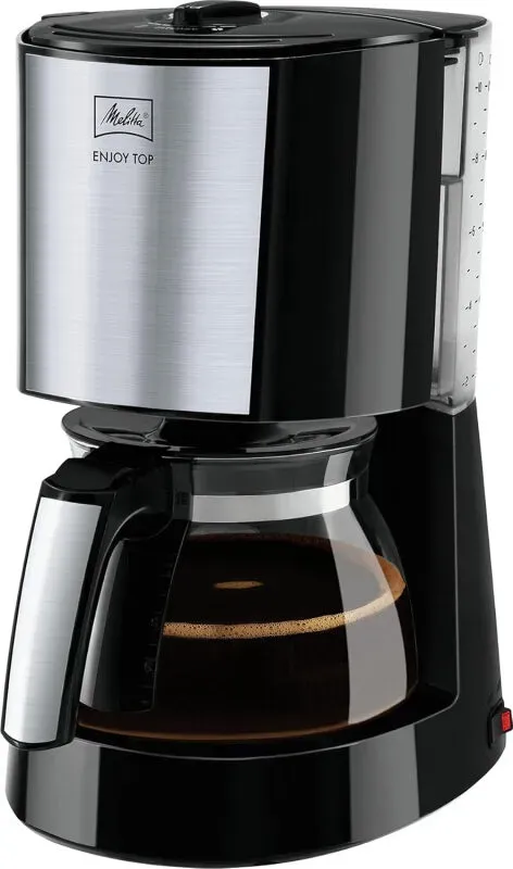 Kategorie: Kaffeemaschinen - Melitta - GTIN:4006508214471 - Der Melitta Enjoy Top 1017-04 ist eine schlanke Drip-Kaffeemaschine mit Glasgefäß und Edelstahl-Optik, die bis zu 10 Tassen zubereitet. Die AromaSelector-Funktion ermöglicht eine einstellbare Stärke. Er verfügt über eine automatische Abschaltautomatik, einen abnehmbaren Schwenkfilter und spülmaschinenfeste Teile für einfache Reinigung. - 47,99 Euro bei Joybuy - gefunden von billiger.de Ein erschwingliches Modell mit Thermokanne, das den Kaffee länger warm hält. ![]() ![]() Melitta ENJOY II THERM SCHWARZ EU