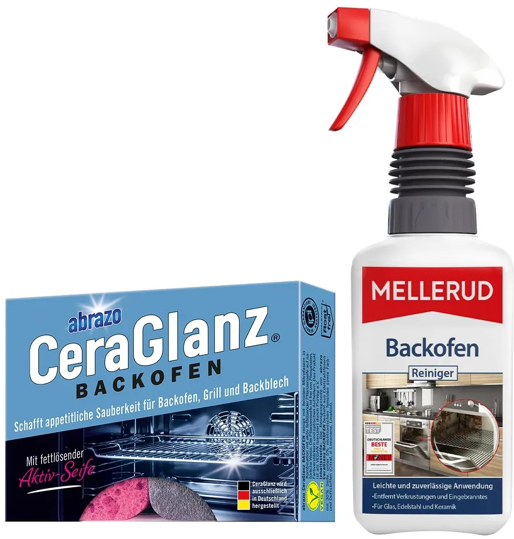 16.98 /l - Kategorie: Reinigungsmittel - Mellerud - GTIN:4004666002404 - Der Mellerud Backofen- und Grillreiniger beseitigt selbsttätig und schnell eingebrannte Speisereste, Fett und Verkrustungen. Er ist im Haus und im Garten einsetzbar und eignet sich für Keramik-, Edelstahl- und Emailleoberflächen. Inhalt: 0,5 l - 8,49 Euro bei OBI - gefunden von billiger.de Dieses Set enthält zwei Reiniger mit Aktivseife, die speziell für hartnäckige Verkrustungen entwickelt wurden. ![]() ![]() abrazo CeraGlanz BACKOFEN-Set | 2 Reiniger mit Aktivseife | gegen hartnäckige Verkrustungen | MELLERUD Backofen Reiniger | 1 x 0,5 l | effizientes Spray zur Reinigung von Eingebranntem