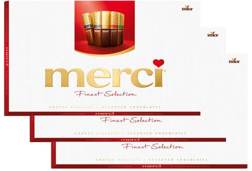 Zustand: Neu - 28,68 € / kg - Riegel Schokoladenriegel - merci - - EAN: 4014400900217 - Schokoladenart: Milchschokoladenriegel-Sortiment Anlass: perfekt für Geburtstage, Weihnachten und Glückwünsche Geschmack: reichhaltiger Schokoladengeschmack Herkunftsland: Deutschland Paketgewicht: 1,6 kg - 2 Händler im amazon.de Marketplace Dieses 3er-Pack von Kaufland.de für 43,32 Euro ist eine gute Option für den Kauf von drei Packungen. ![]() ![]() Storck merci Finest Selection Schokoladensortiment 400g 3er Pack