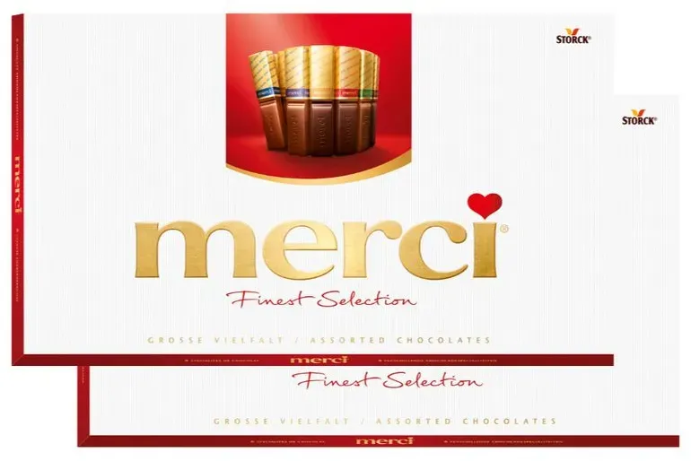 22.45 / 1 kg - merci - EAN: 4014400900217 - merci Finest Selection Große Vielfalt ist Schokoladengenuss in 8 erlesenen Spezialitäten. Stück für Stück liebevoll ausgewählt, mit hochwertiger Schokolade, raffinierten Füllungen und einzigartigen Kompositionen. - bei metro.de - aus Yadore Produktdaten Dieses eBay-Angebot ist mit 8,99 Euro eine preiswerte Möglichkeit, eine einzelne Packung merci 400g zu erwerben. ![]() ![]() (22,48€/1kg) Storck - Merci Große eBay Vielfalt, Finest Selection, 400g Packung
